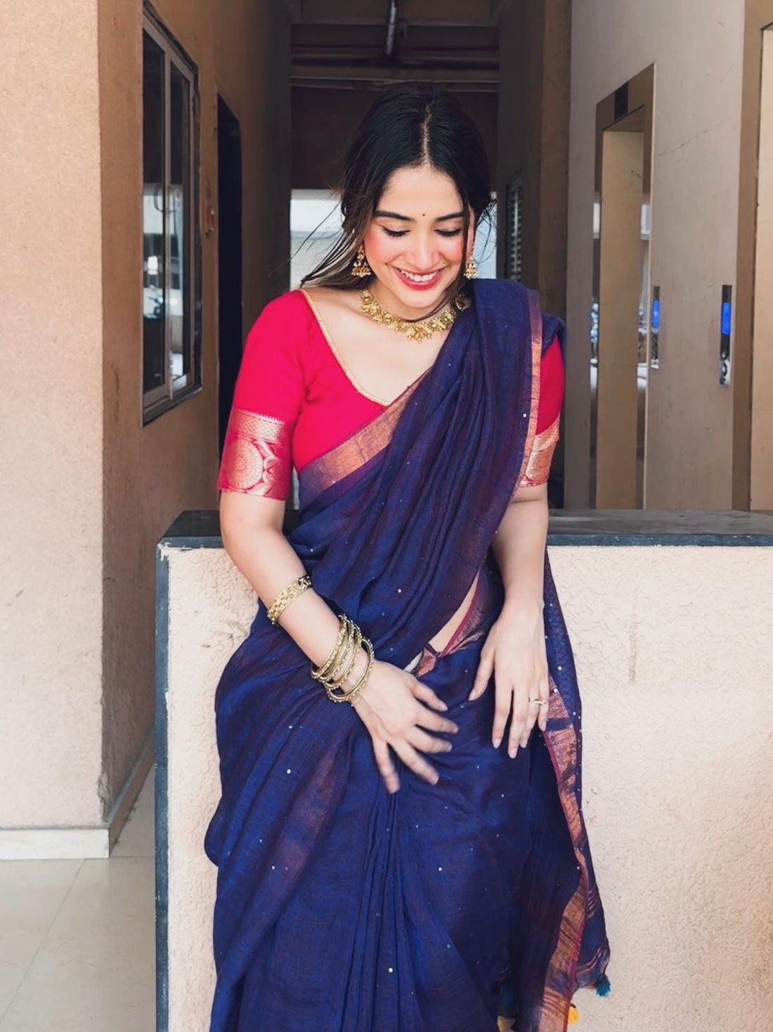 Ishira| Purple linen saree with golden zari & sequin highlights