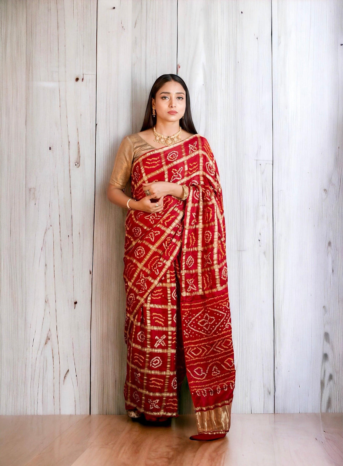 Add regal charm to your ethnic collection with this Pure Gaji Silk Bandhani Ghatchola Saree...