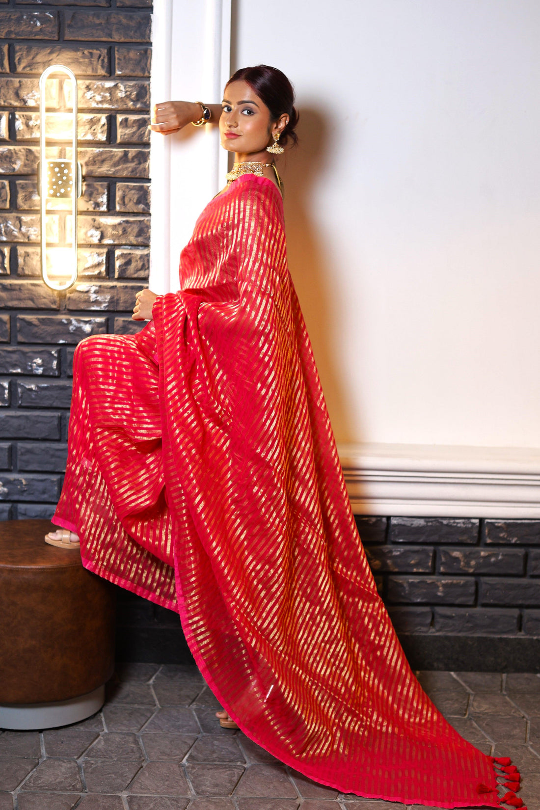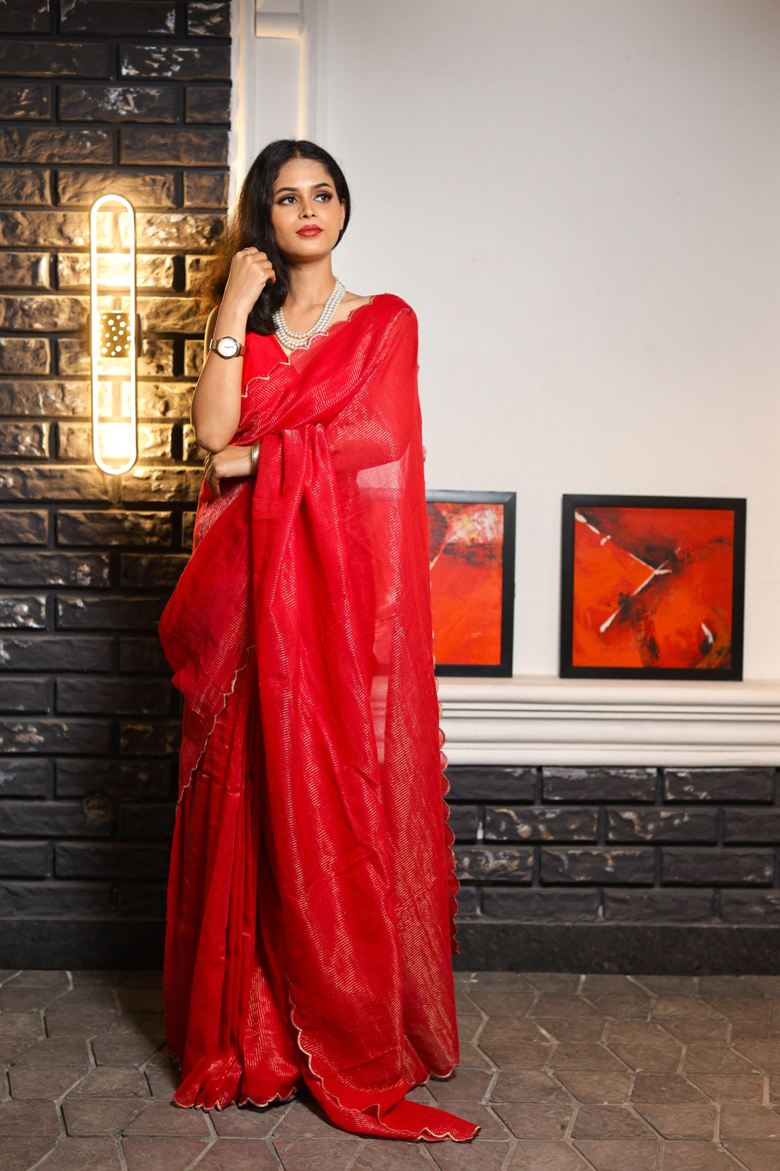 "Iyla" Red Saree handloom Cotton with Tissue weave