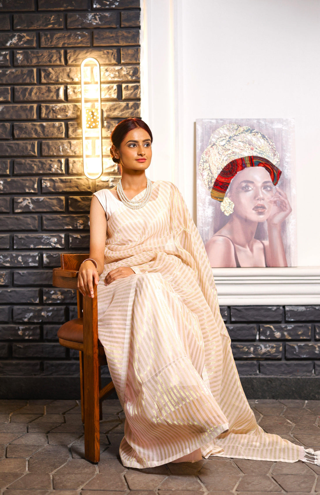"Jansi" Beige Tissue strip saree is expertly crafted with high-quality mul cotton material and adorned...