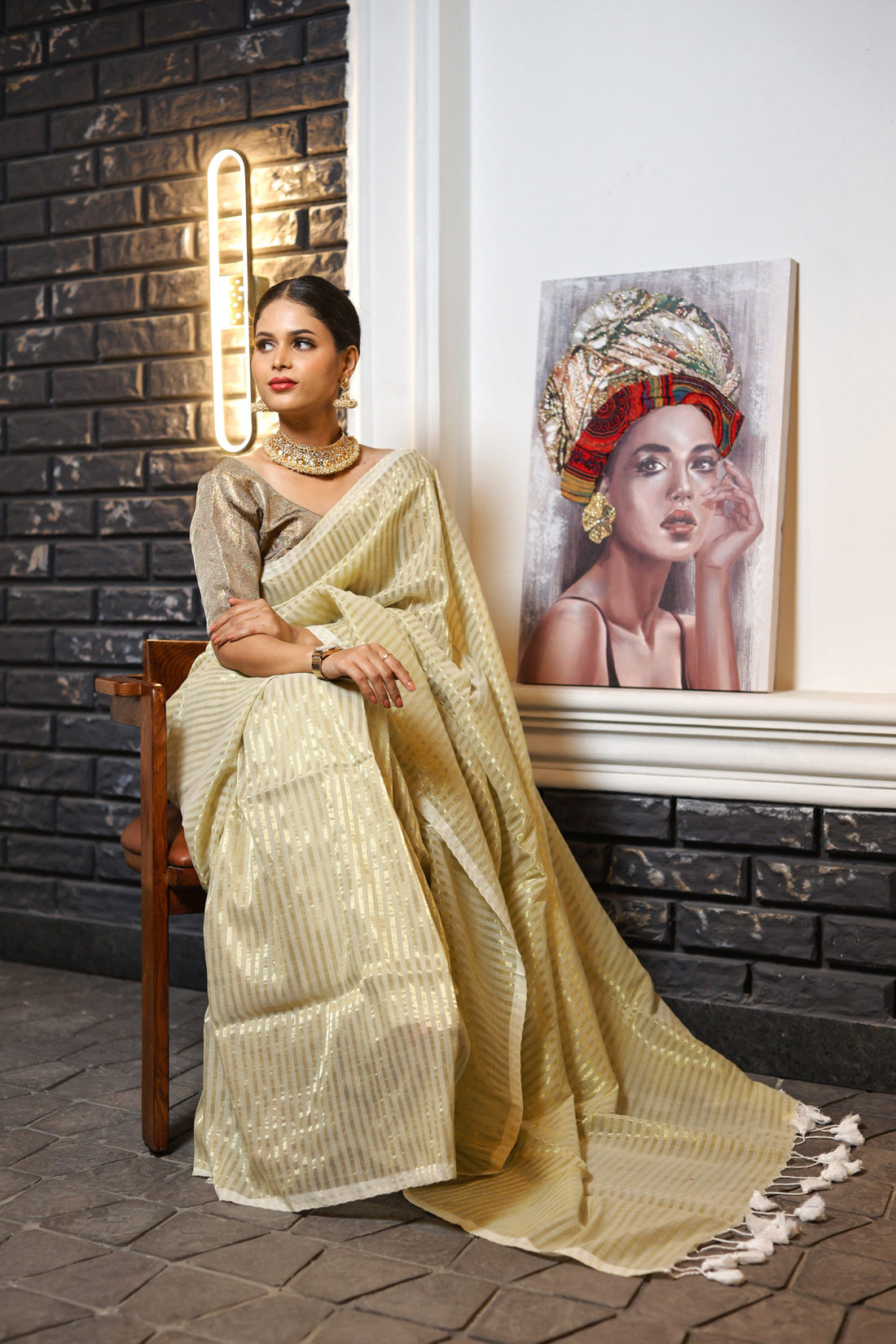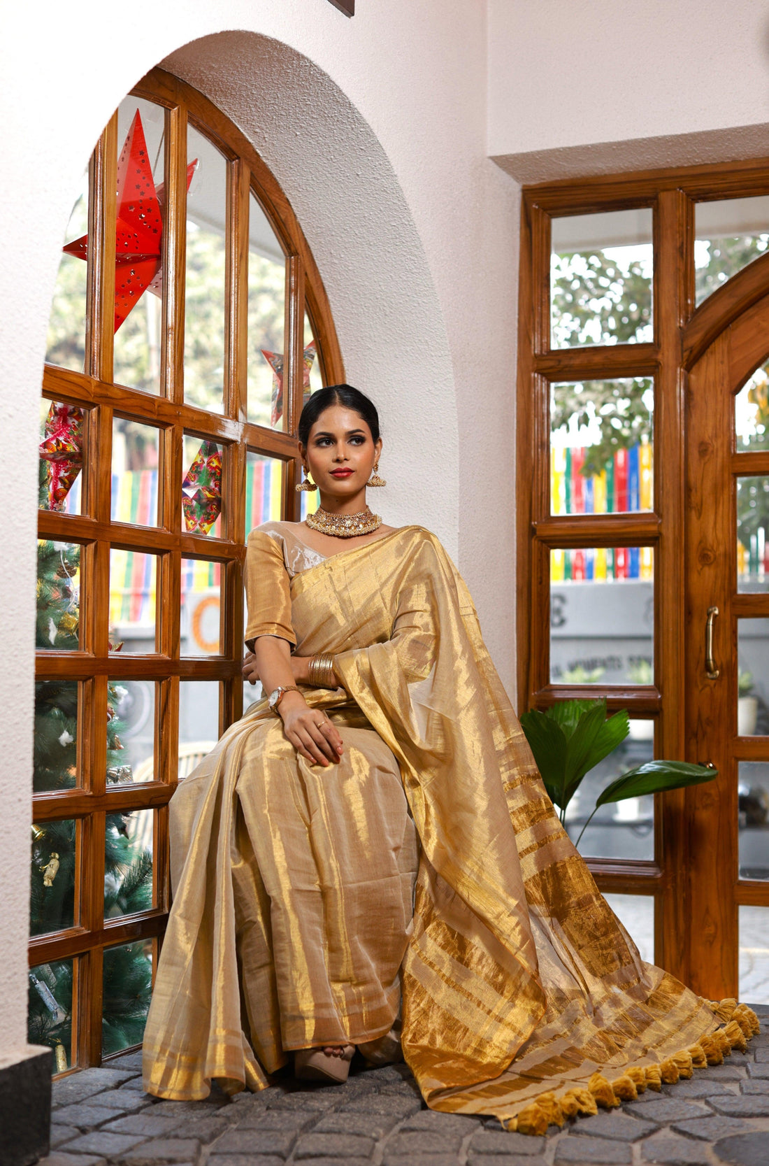 "Sunahari" Gold And Beige Handloom Tissue Saree