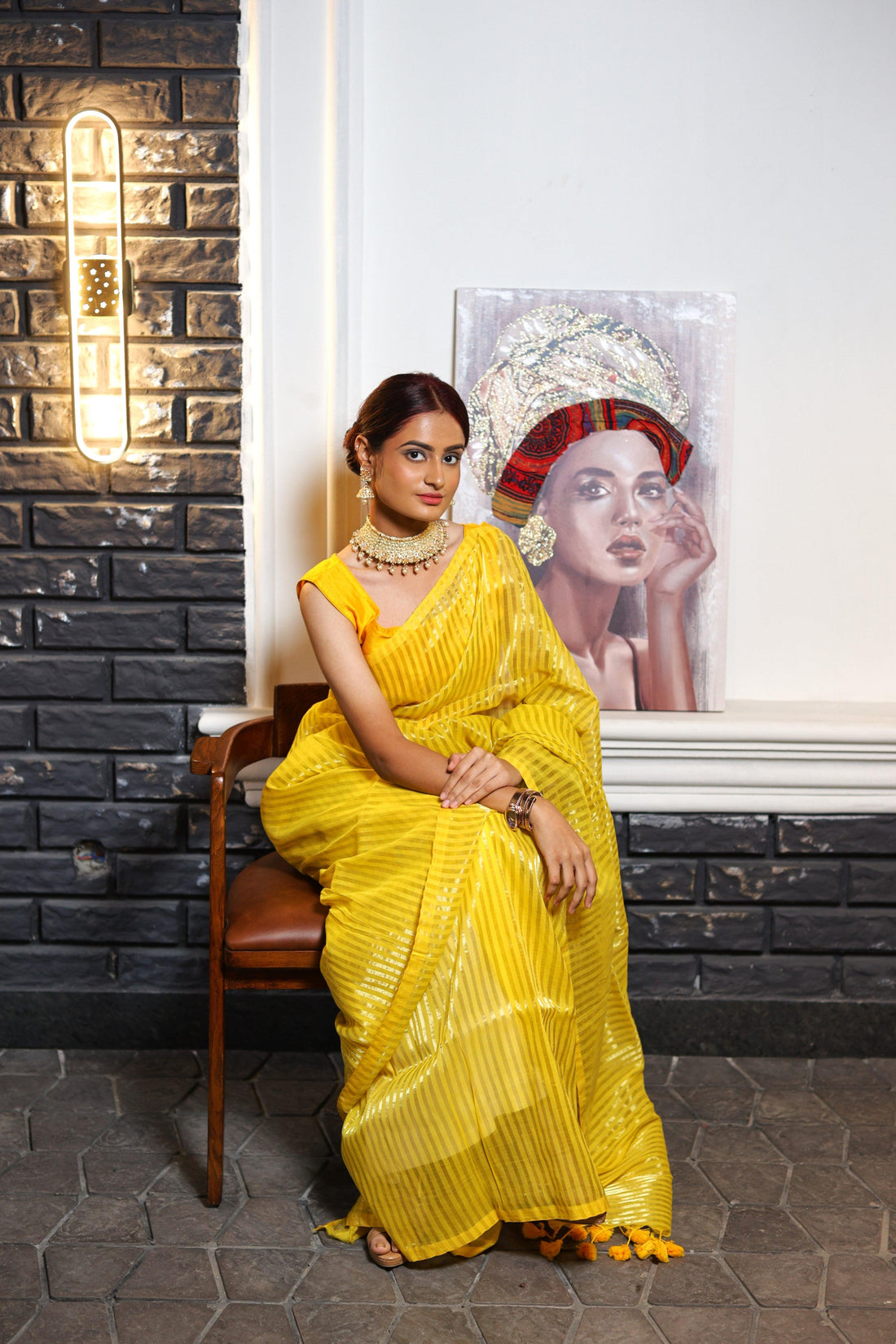Aavya| Yellow handwoven tissue saree with Temple Border