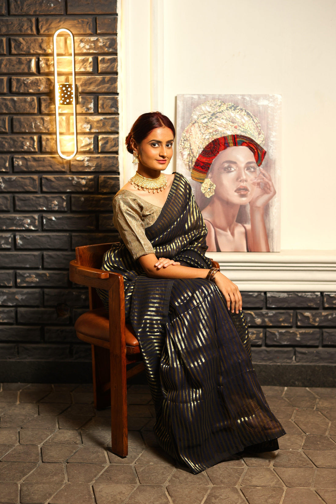 "Saujanya" Navy Blue Tissue strip saree is expertly crafted with high-quality mul cotton material and...