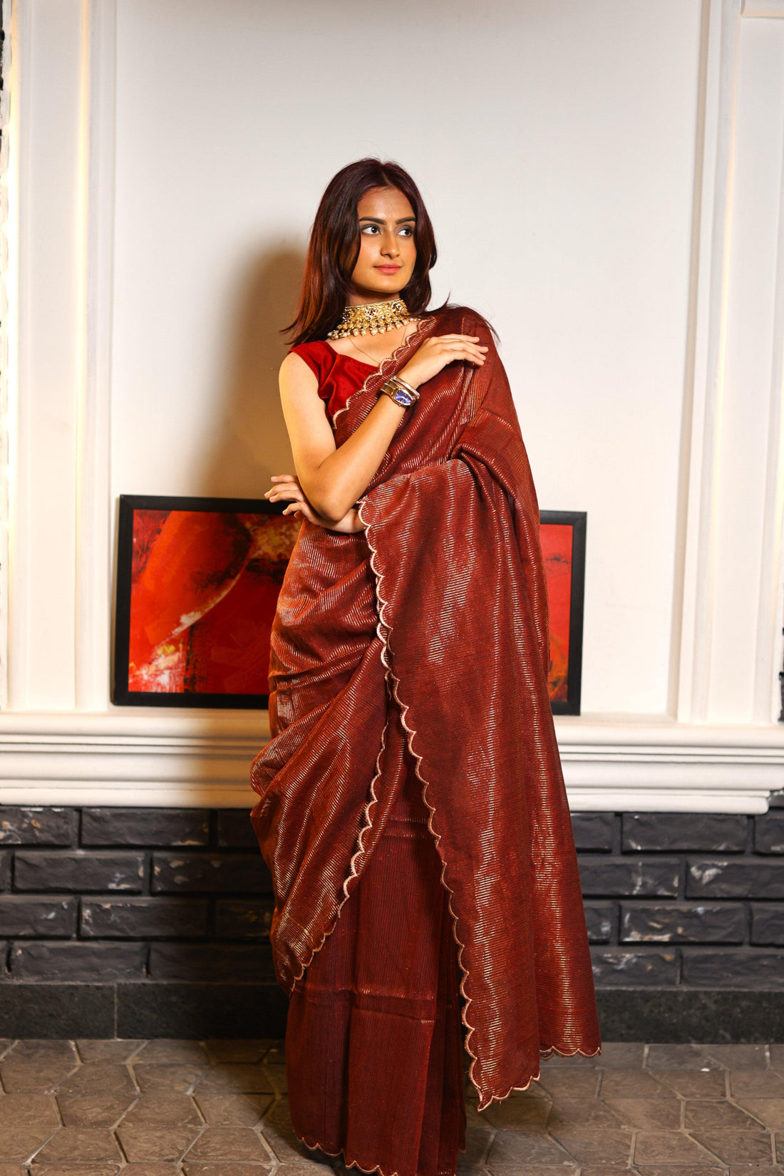 CHARVI| Copper Gold handwoven tissue saree with Temple Border