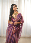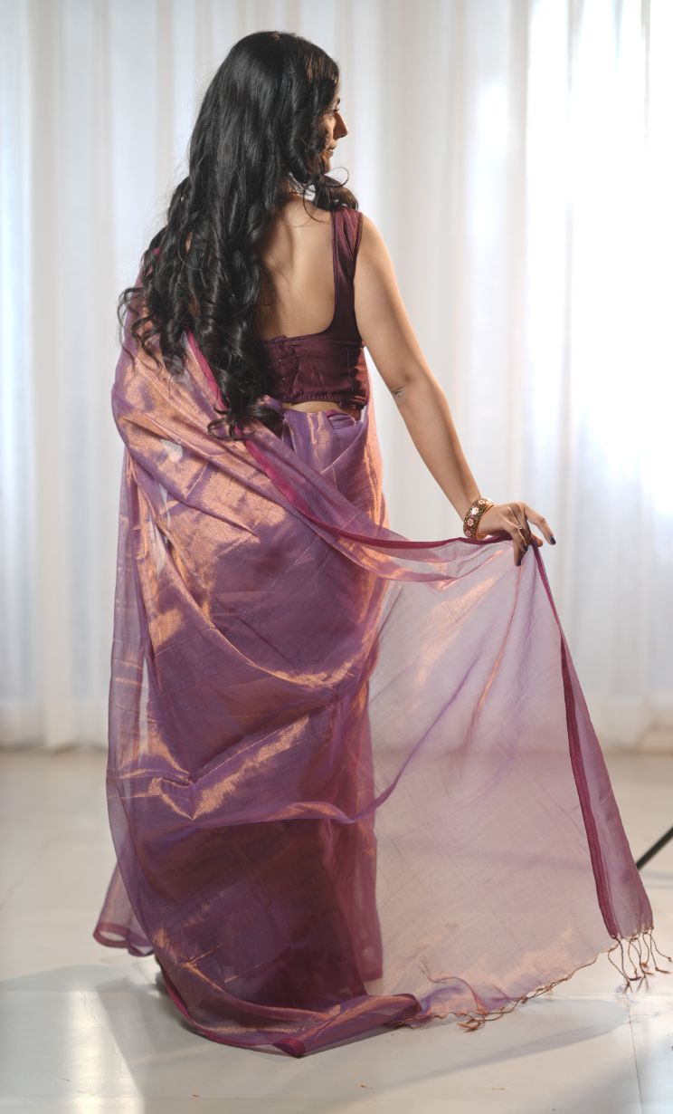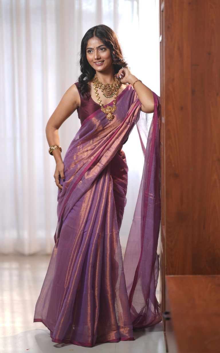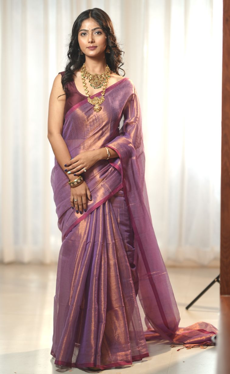 Turn heads with the "Amba" Metallic Pink handwoven tissue saree, where shimmer meets charm! Its glowing pink hue paired with a solid border adds a pop of fun to any festive occasion. Light, airy, and effortlessly stylish, this saree brings a playful twist to traditional elegance.