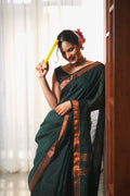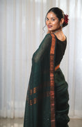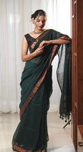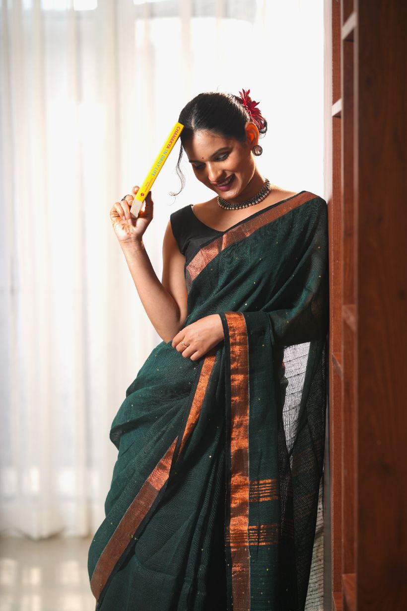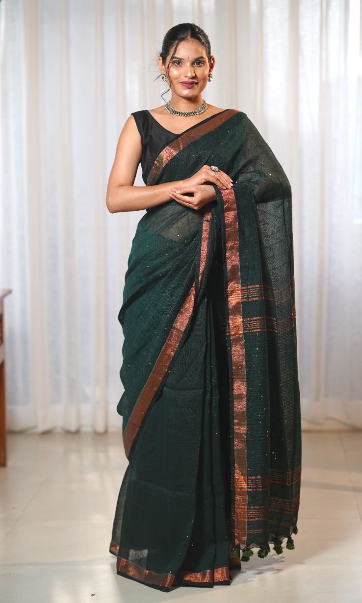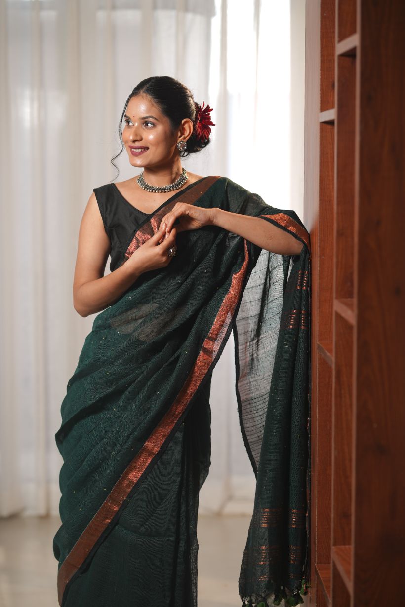 Add a dash of joy to your wardrobe with the Ambika green linen saree, featuring shimmering golden zari and lively sequin accents. Soft and breathable, this saree lets you twirl and sparkle effortlessly, perfect for brightening up any festive moment with a playful twist.