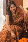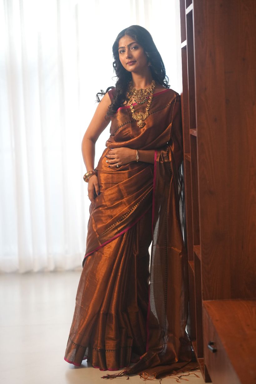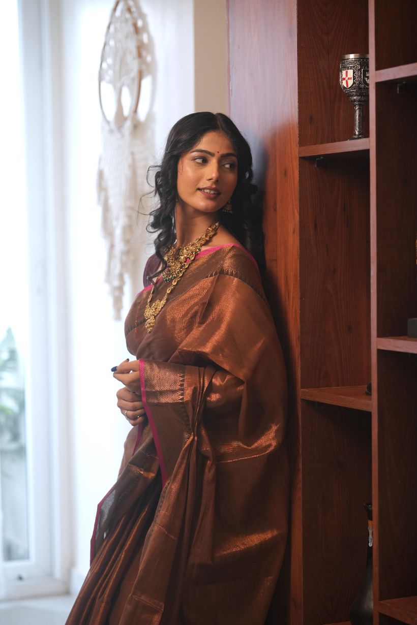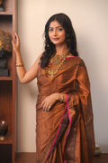 CHARVI| Copper Gold handwoven tissue saree with Temple Border