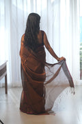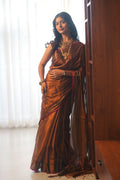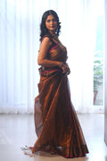 Drape yourself in the charm of tradition with the CHARVI Copper Gold handwoven tissue saree. Featuring a striking temple border, this saree blends rich copper and gold hues to light up any occasion. Lightweight yet elegant, its intricate weave promises to make you the star of every celebration with a playful sparkle.