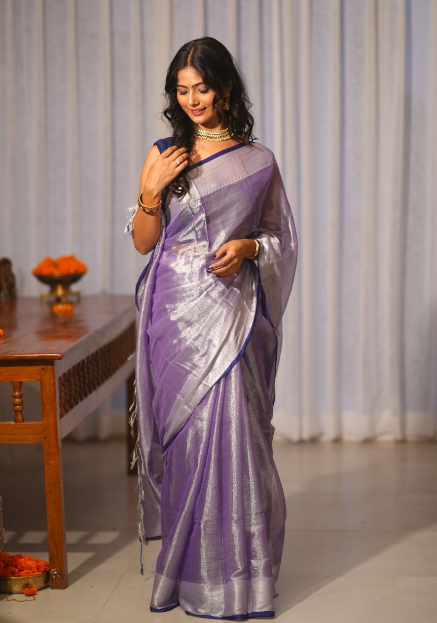 Bring a burst of joy to your look with the "Chhaya" saree! This metallic blue handwoven tissue saree dazzles with its vibrant shimmer and playful temple border, blending tradition with a fun, fresh vibe. Lightweight and eye-catching, it’s perfect for celebrations where you want to shine and dance the day away.