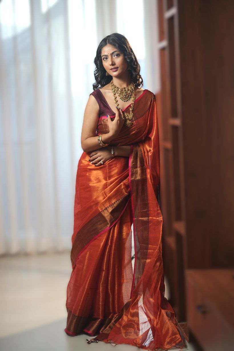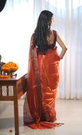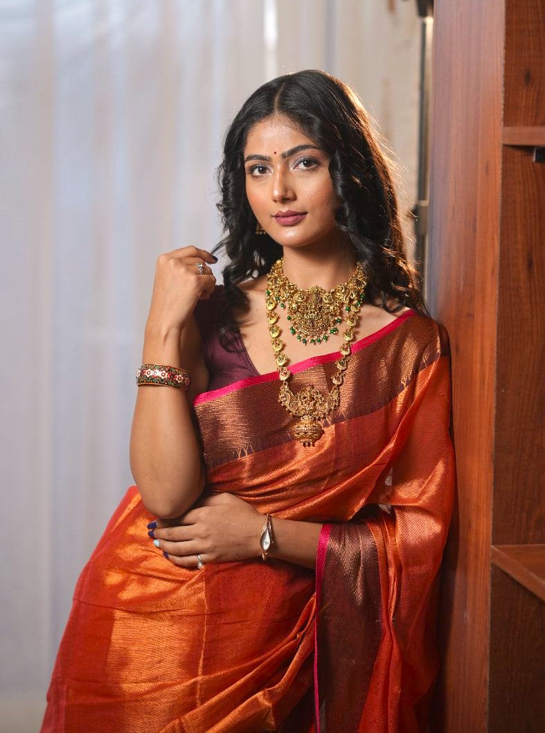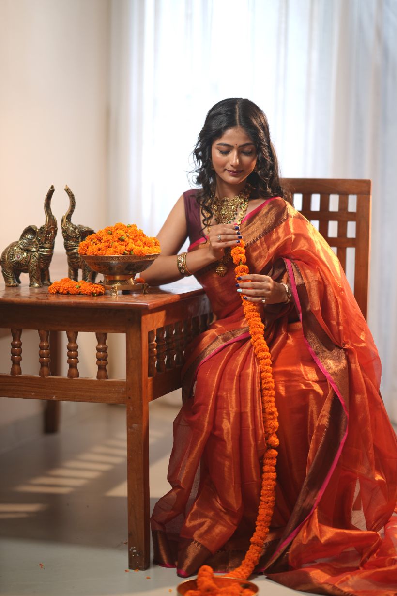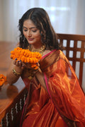 Chitra | Metallic Orange handwoven tissue saree with Temple Border