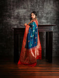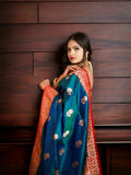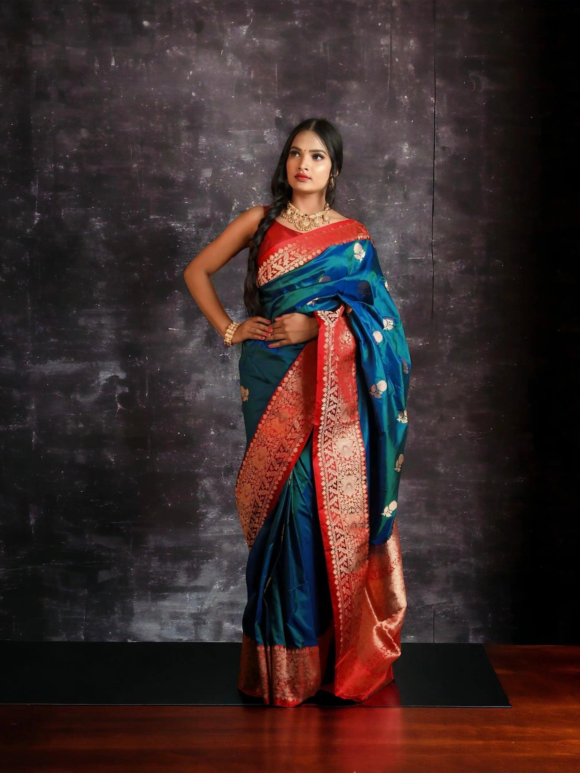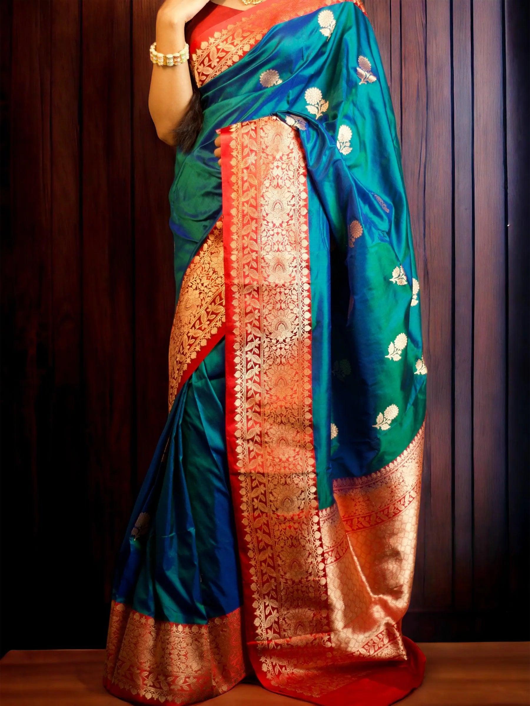 Cobalt Blue Katan Silk Banarasi Saree with Copper Zari butta on the body and Contrast Maroon with copper Zari Border. Includes Unstitched Blouse