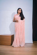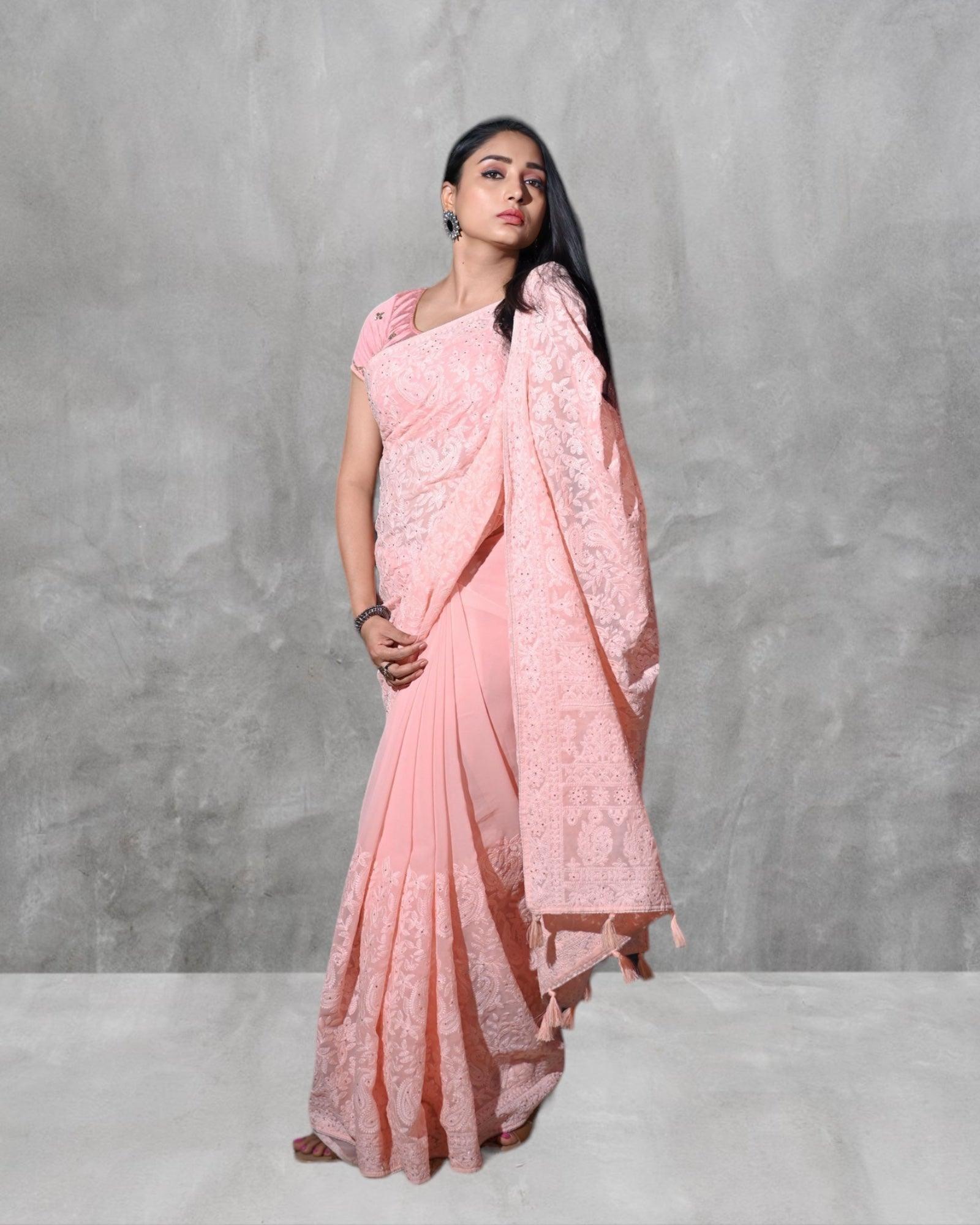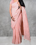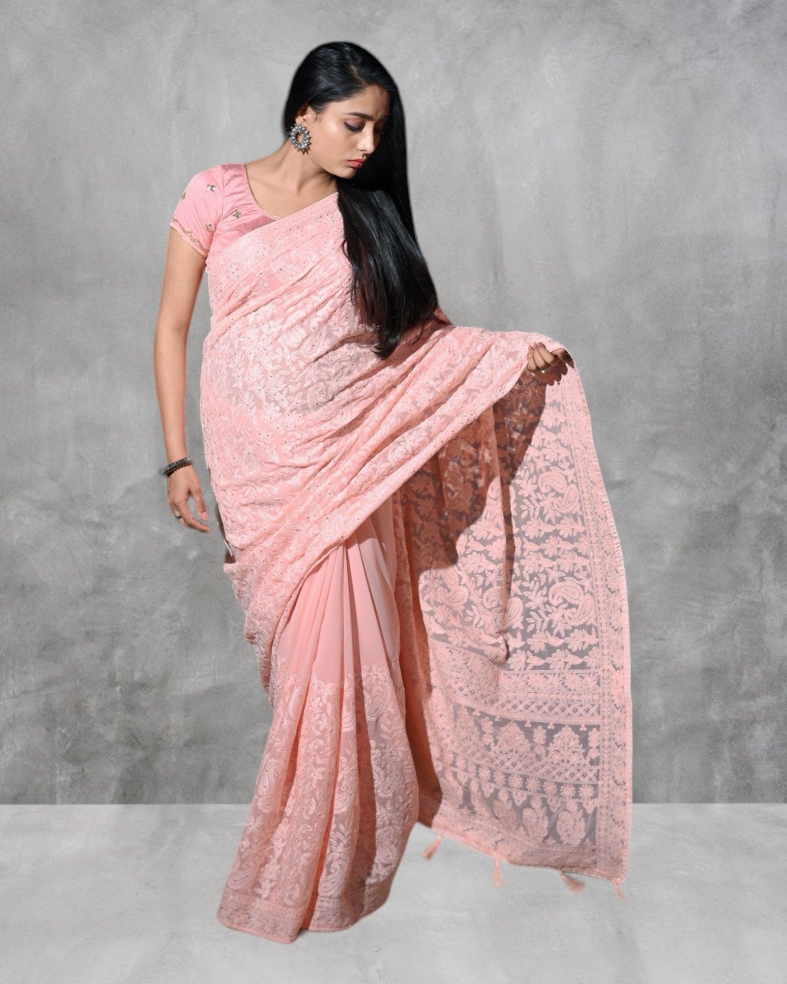 Enhance your elegance with this stunning Peach Chiffon saree, beautifully adorned with intricate Chikankari embroidery all over the body. The soft and airy chiffon fabric ensures comfort and grace, perfect for any occasion. The delicate Chikankari work brings out traditional beauty, adding a touch of sophistication to the saree. Ideal for weddings, festivals, or special events. Comes with an unstitched blouse, allowing you to personalize the fit and style. A blend of timeless elegance and exquisite craftsmanship.