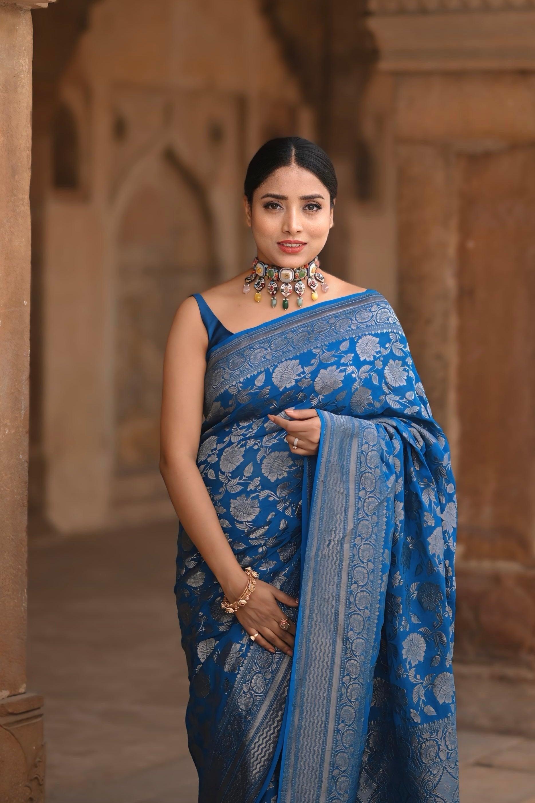 Rama Blue Khaddi Georgette Banarasi Saree with Black Zari Jaal work on the body and Black Zari Border. Includes Unstitched Blouse