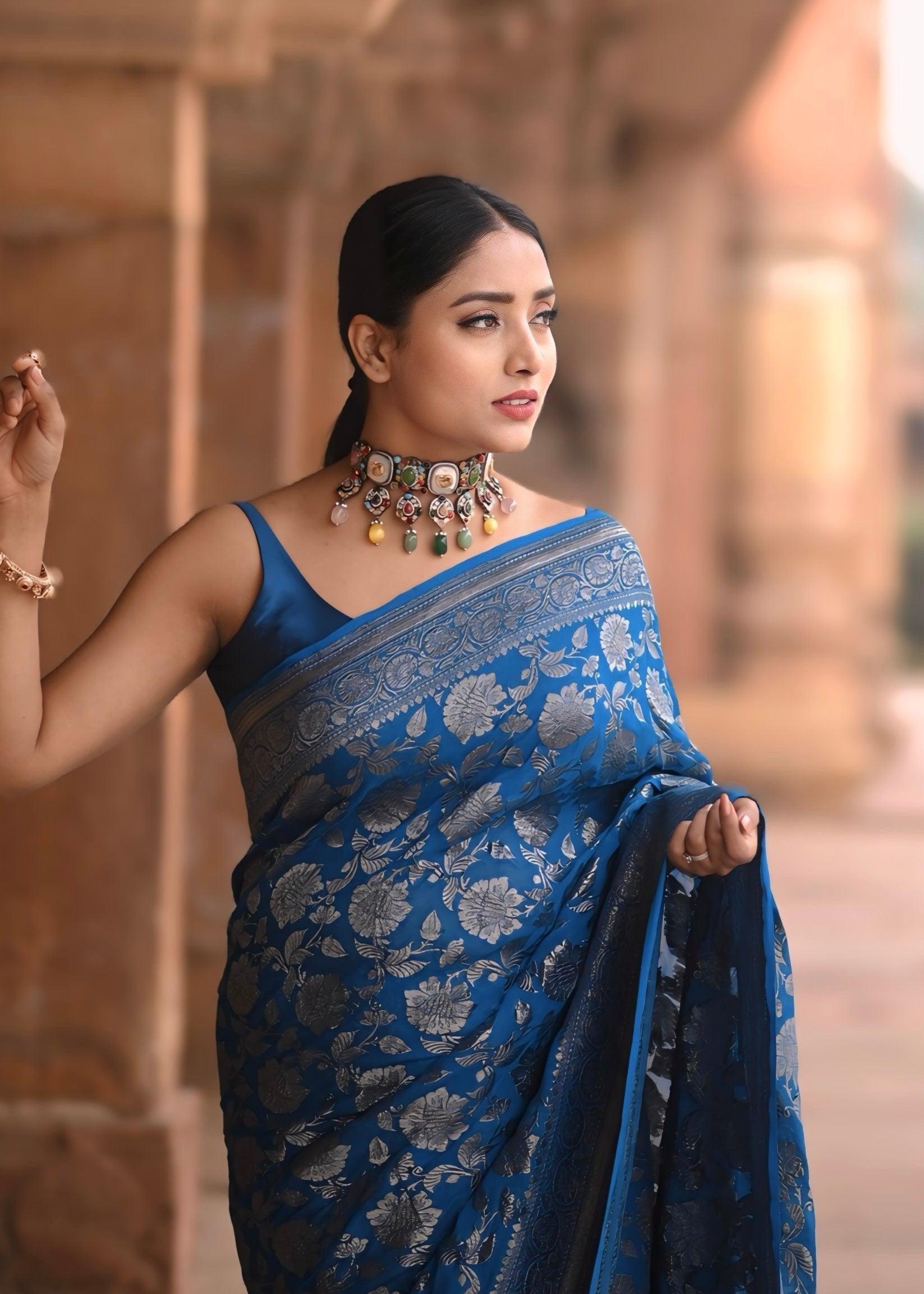Rama Blue Khaddi Georgette Banarasi Saree with Black Zari Jaal work