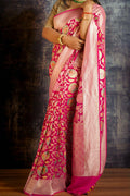 Add luxury to your ethnic collection with this Rani Pink Khaddi Georgette Banarasi Saree, beautifully adorned with rich Zari Jaal work and elegant handbrush Minakari on the body. The soft and flowing Khaddi Georgette fabric gives a graceful drape, perfect for weddings and festive occasions. The glowing golden zari border adds royal charm, while the detailed handwork brings a unique touch. Includes an unstitched blouse, allowing you to style it as you like. A perfect blend of traditional beauty and modern comfort.