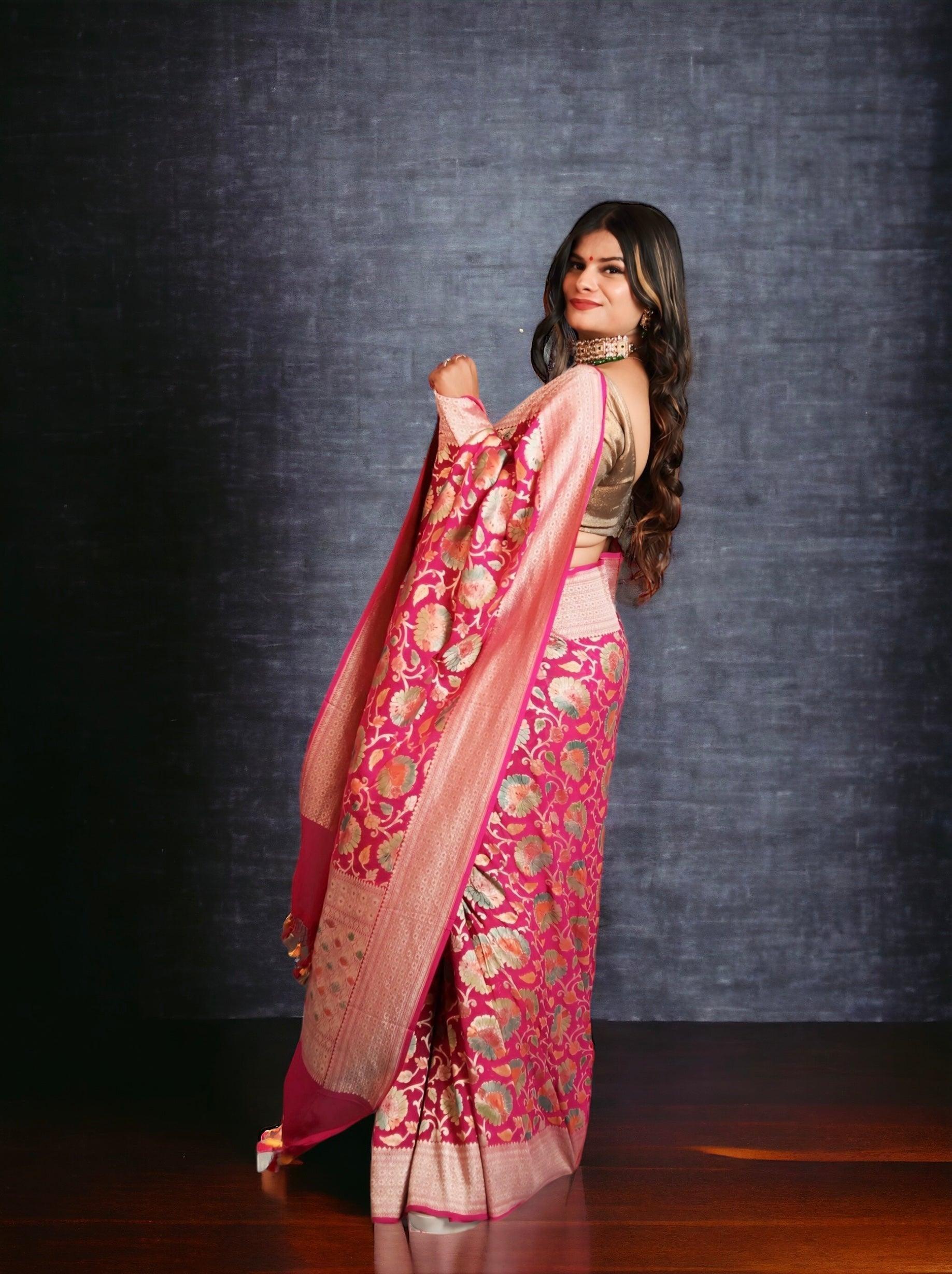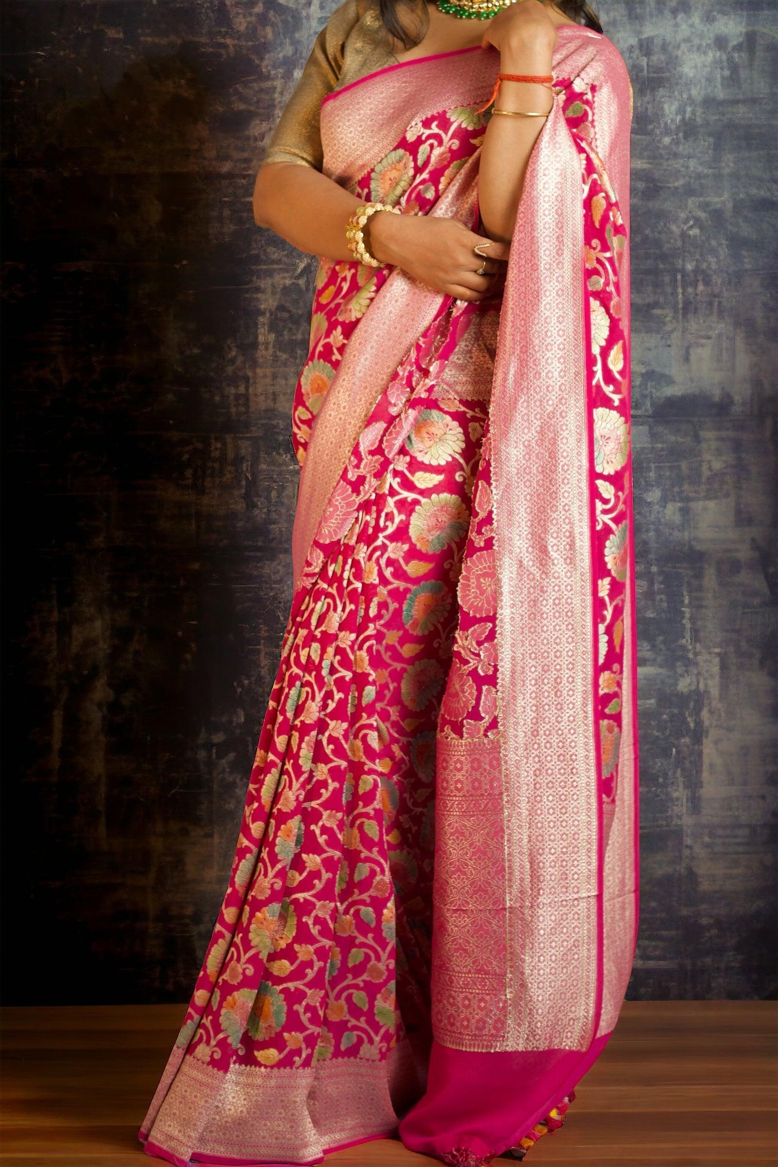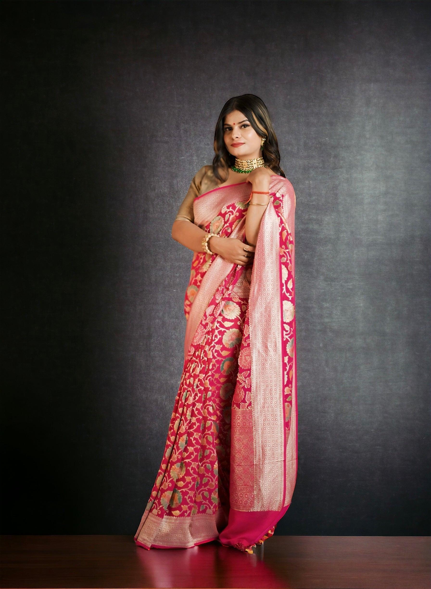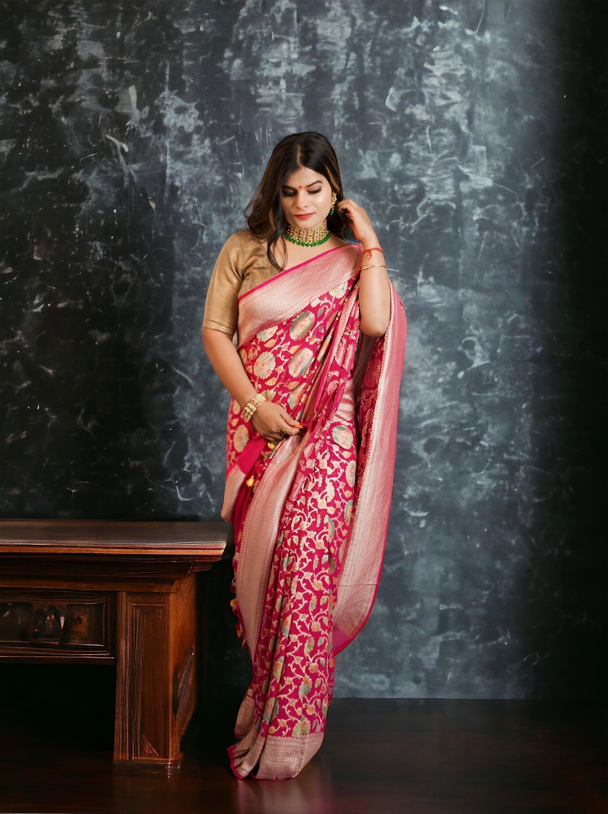 Ranipink Khaddi Georgette Banarasi Saree with Handbrush Minakari