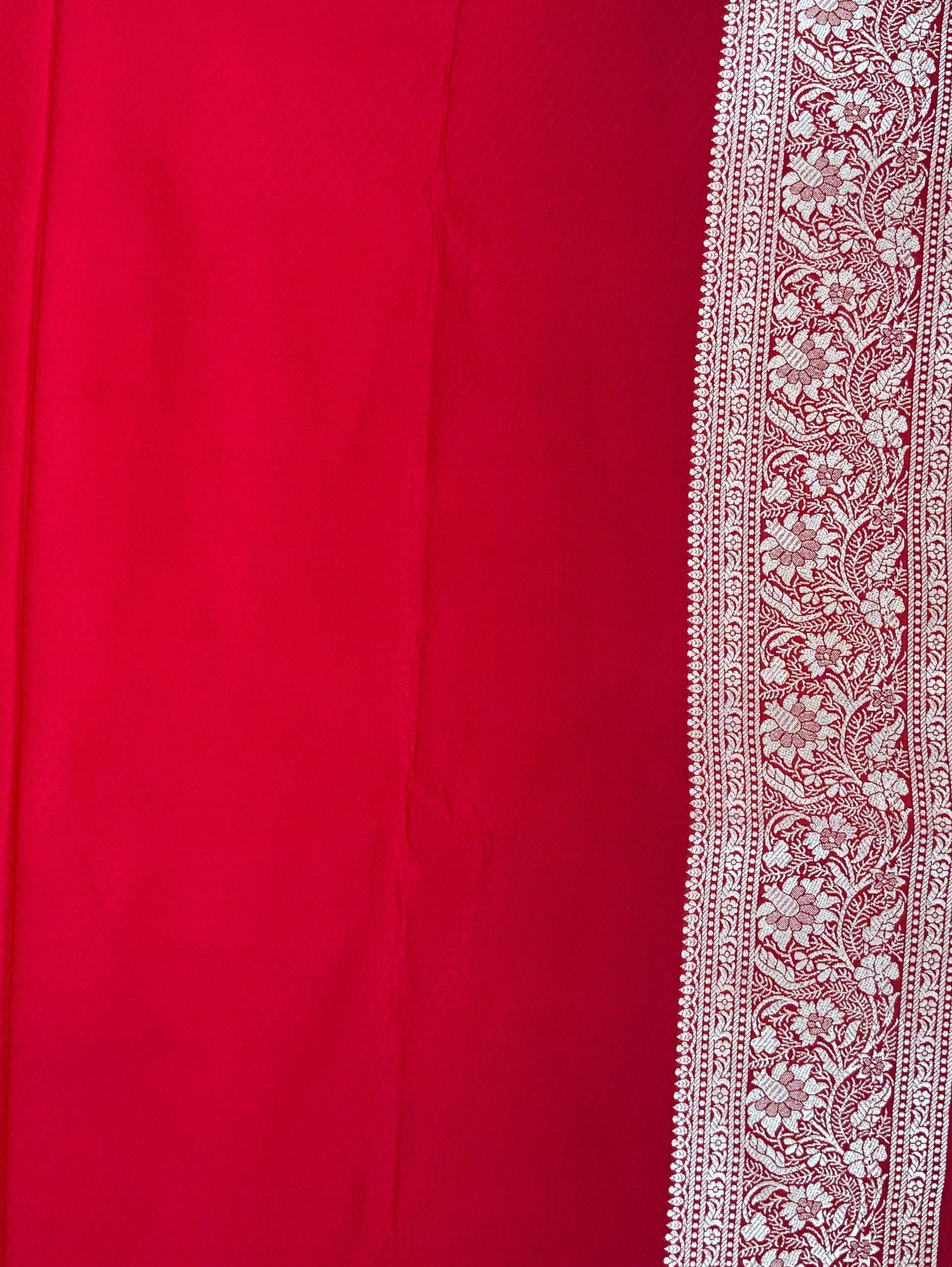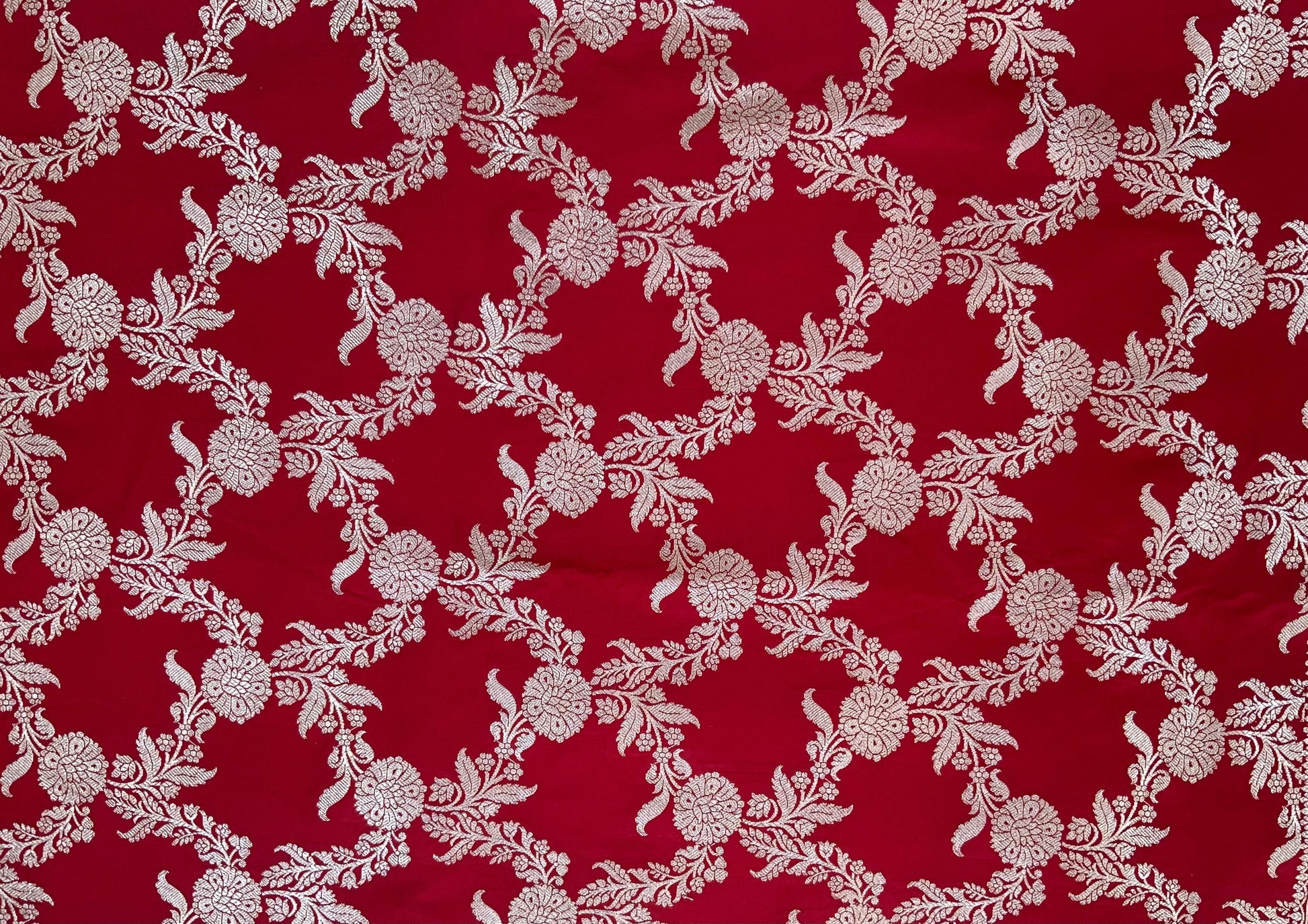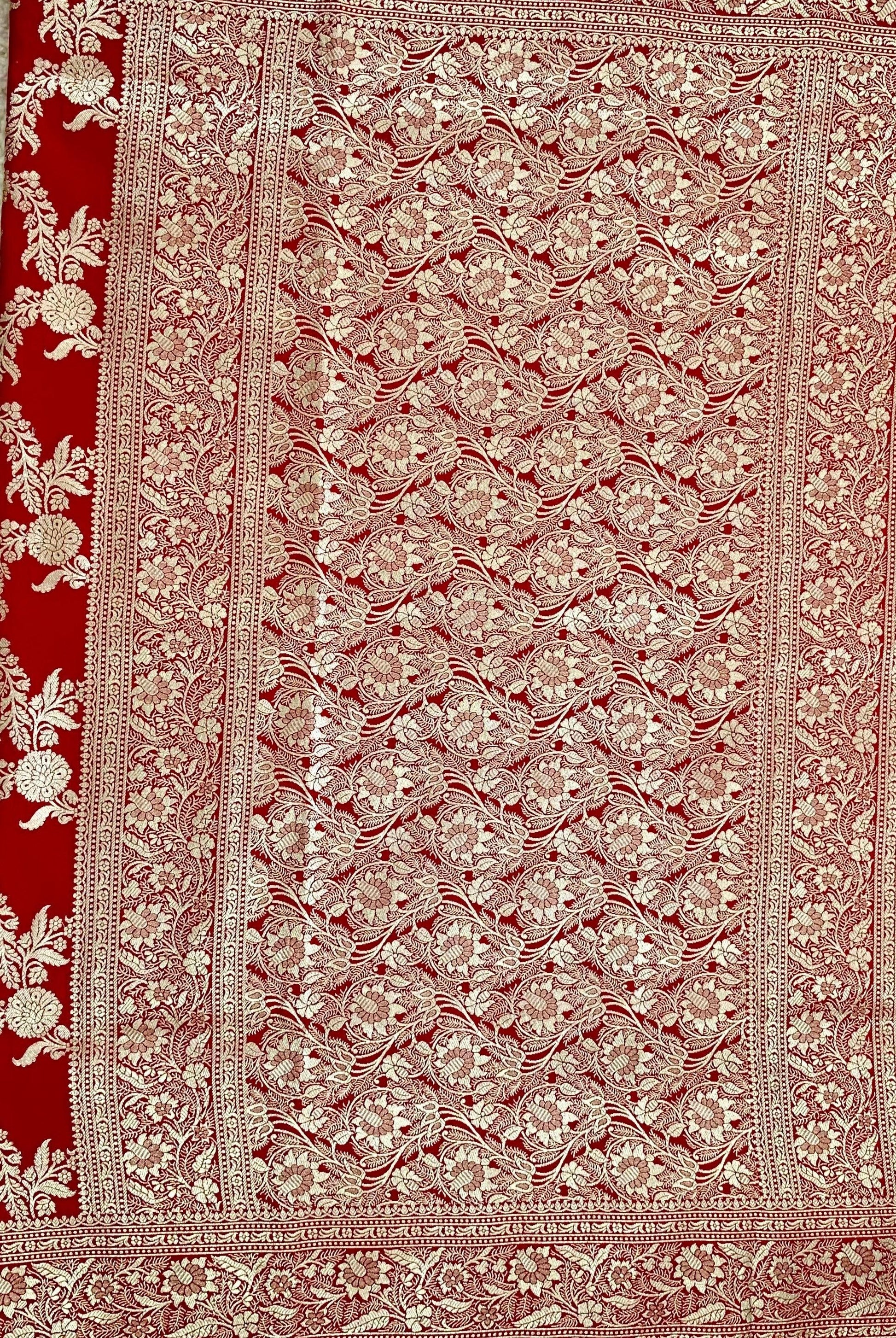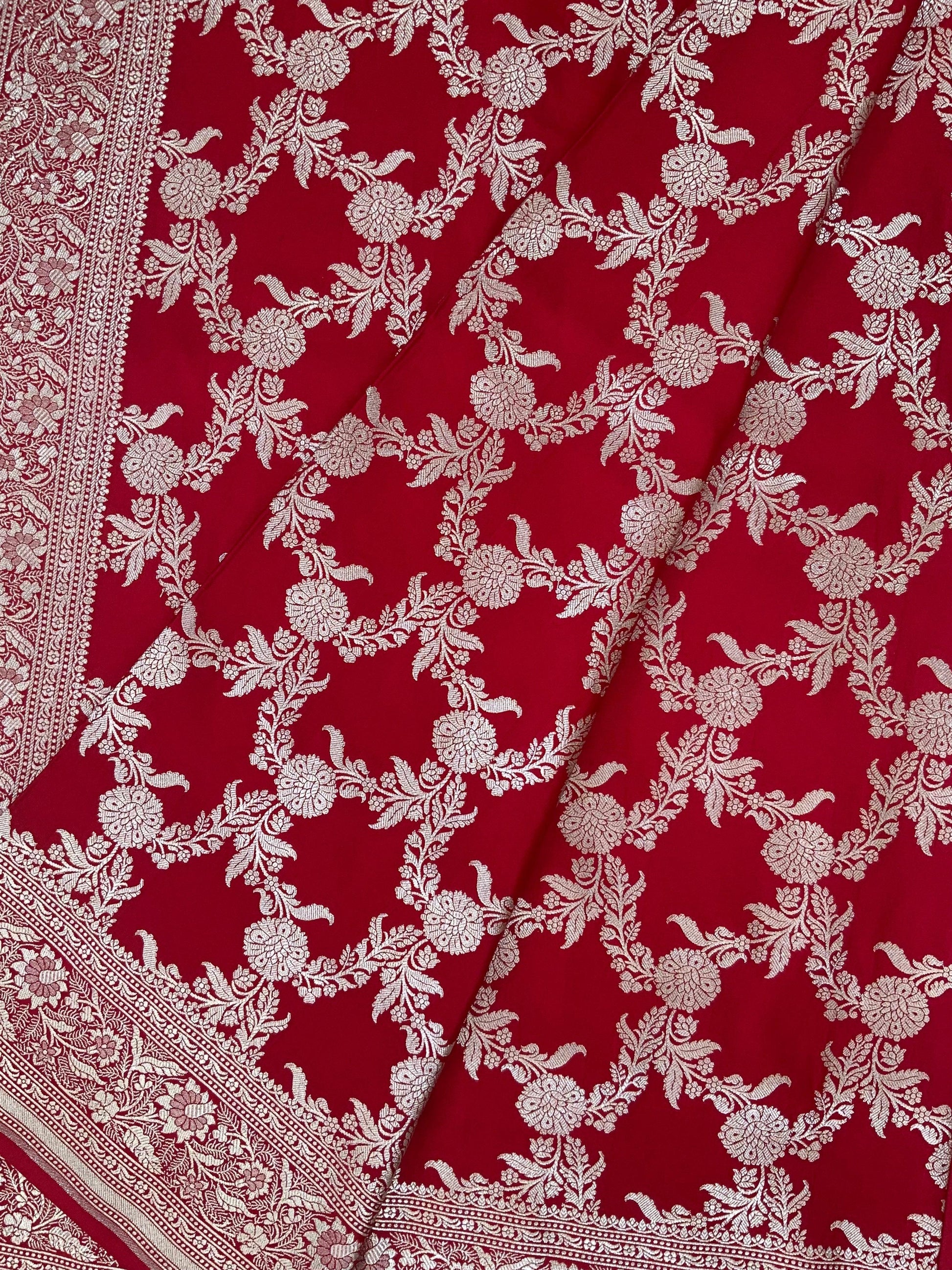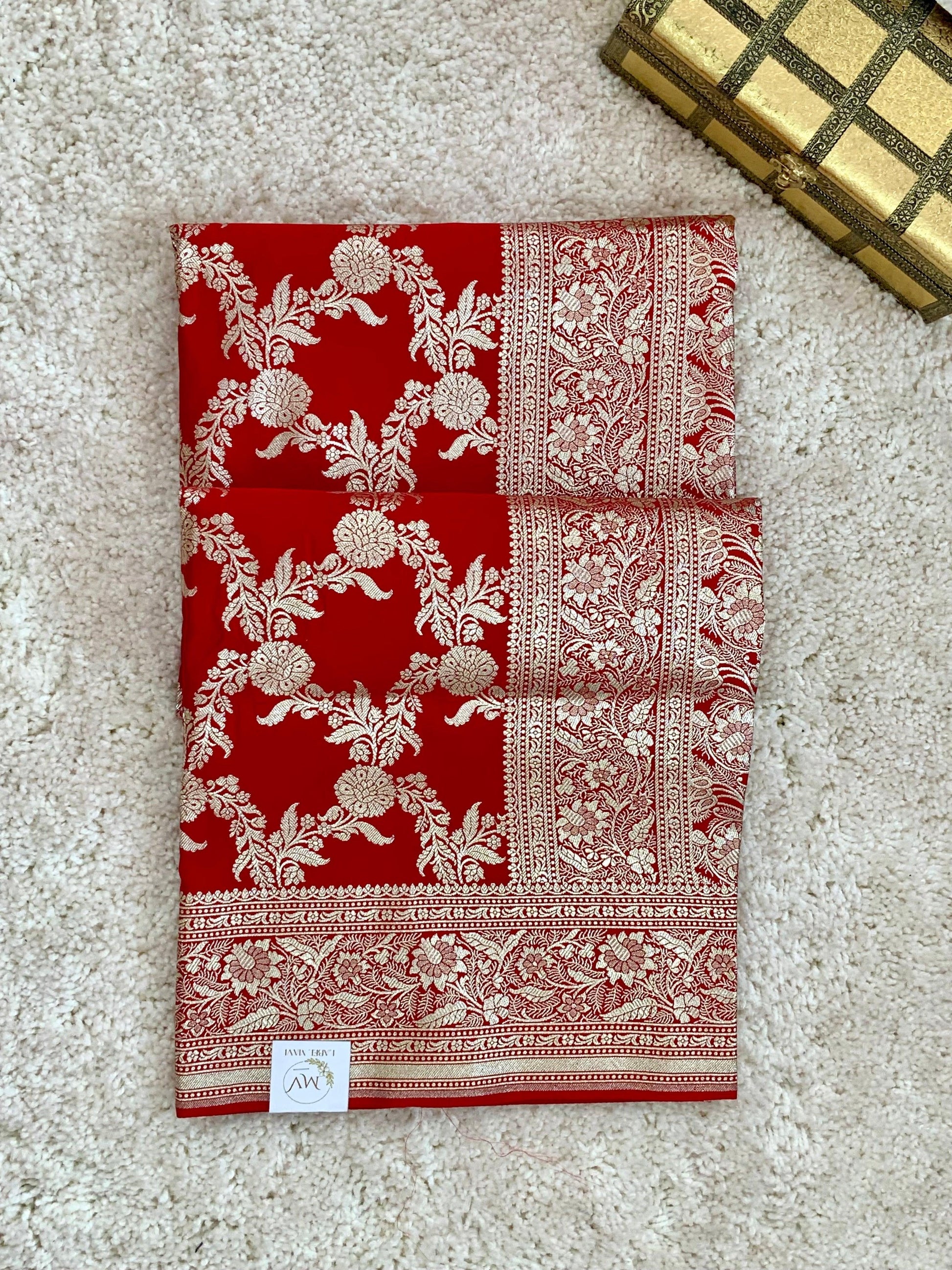Red Banarasi Semi Satain Silk Saree with Golden Zari Jaal work on the body and Zari Border. Includes Unstitched Blouse