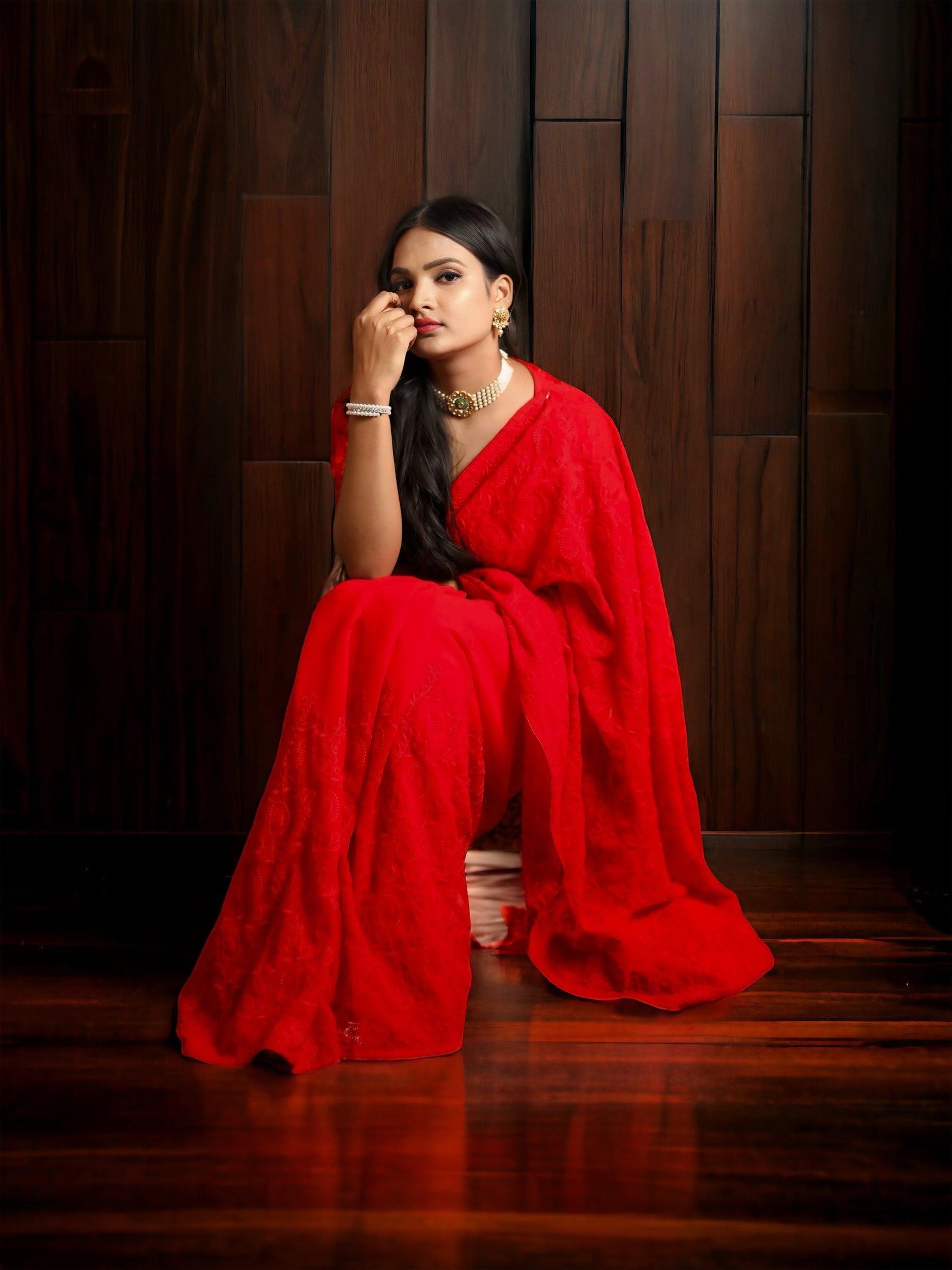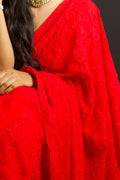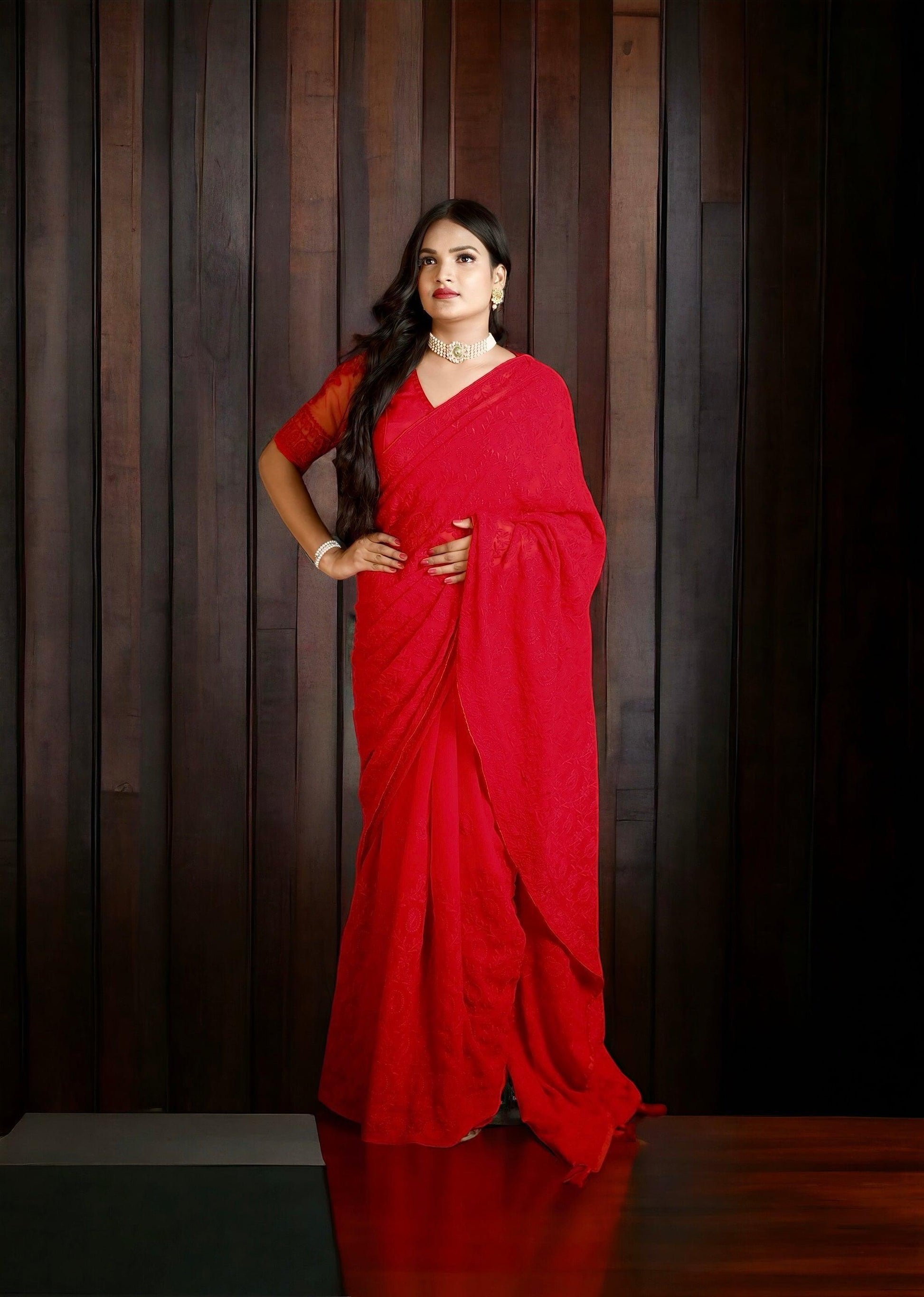 Add a vibrant touch to your wardrobe with this stunning Red Chiffon saree, featuring exquisite Chikankari embroidery all over the body. The lightweight chiffon fabric offers a smooth, comfortable drape, perfect for long wear. The intricate embroidery adds a traditional charm, making this saree ideal for weddings, festivals, or special events. Its rich red color complements the delicate embroidery, creating an elegant look. The saree comes with an unstitched blouse, allowing you to customize the fit and style to your liking. A perfect combination of beauty and comfort.