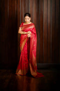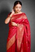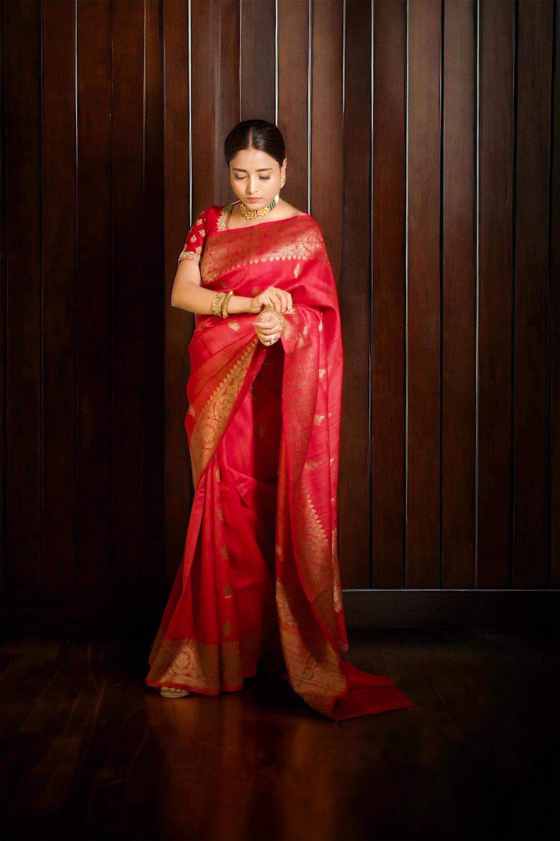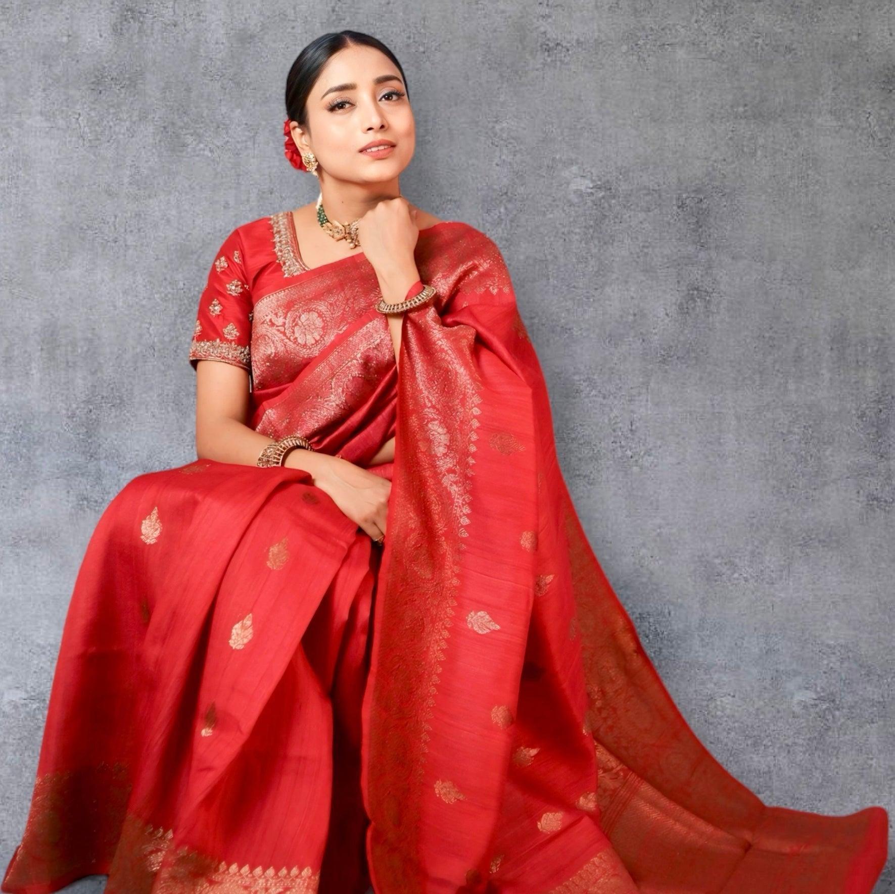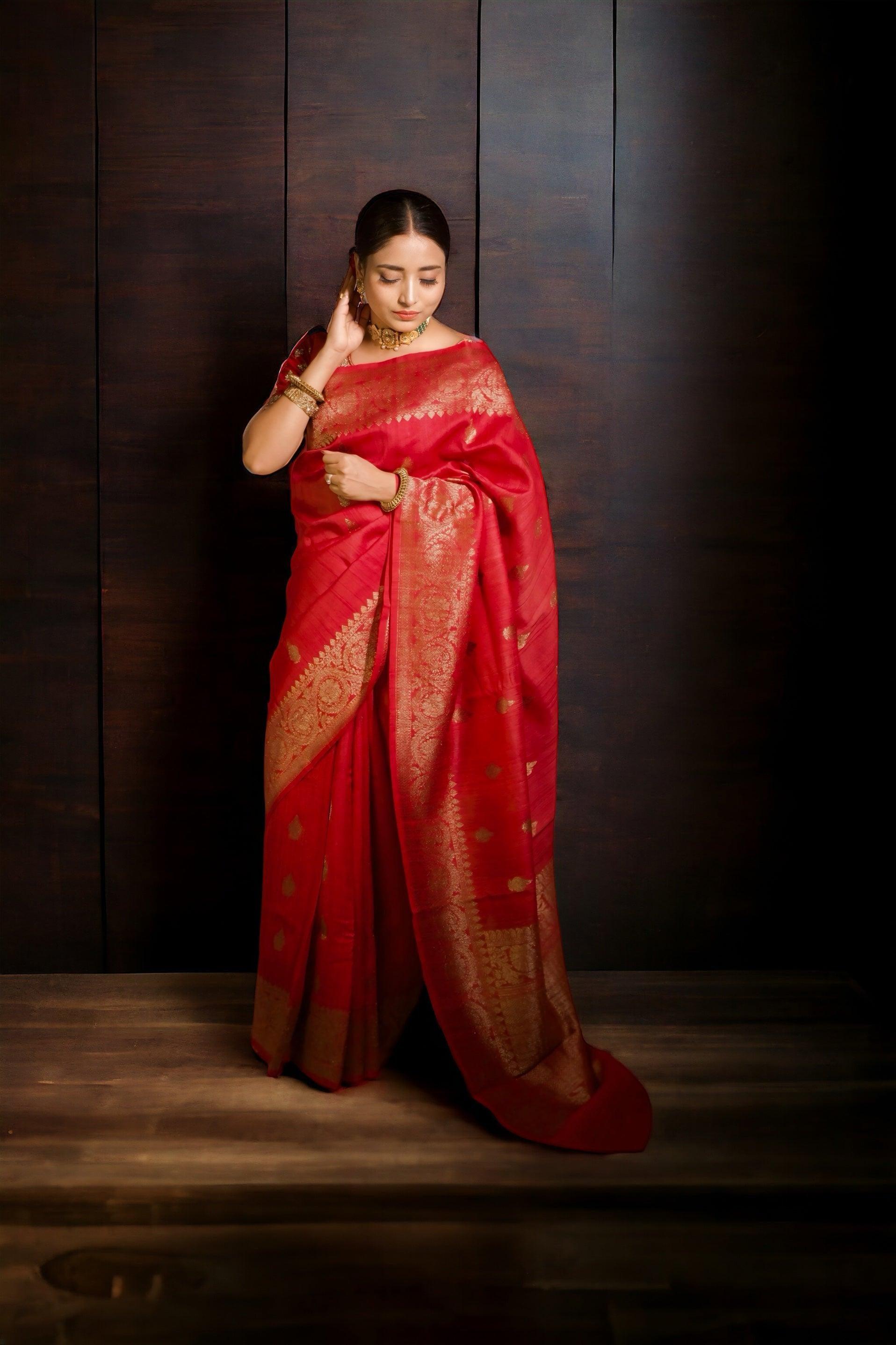 Add a touch of tradition to your wardrobe with this elegant Red Pure Tussar Silk Handloom Banarasi saree. Crafted with care, it features rich Zari Butta work all over the body and a classic copper zari border that adds a regal finish. The soft and textured pure tussar silk fabric offers a graceful drape, perfect for weddings, festive events, or special occasions. This saree includes an unstitched blouse piece, giving you the flexibility to style it your way. A timeless piece that blends traditional craftsmanship with luxurious comfort.