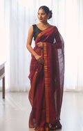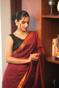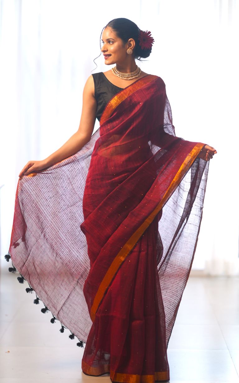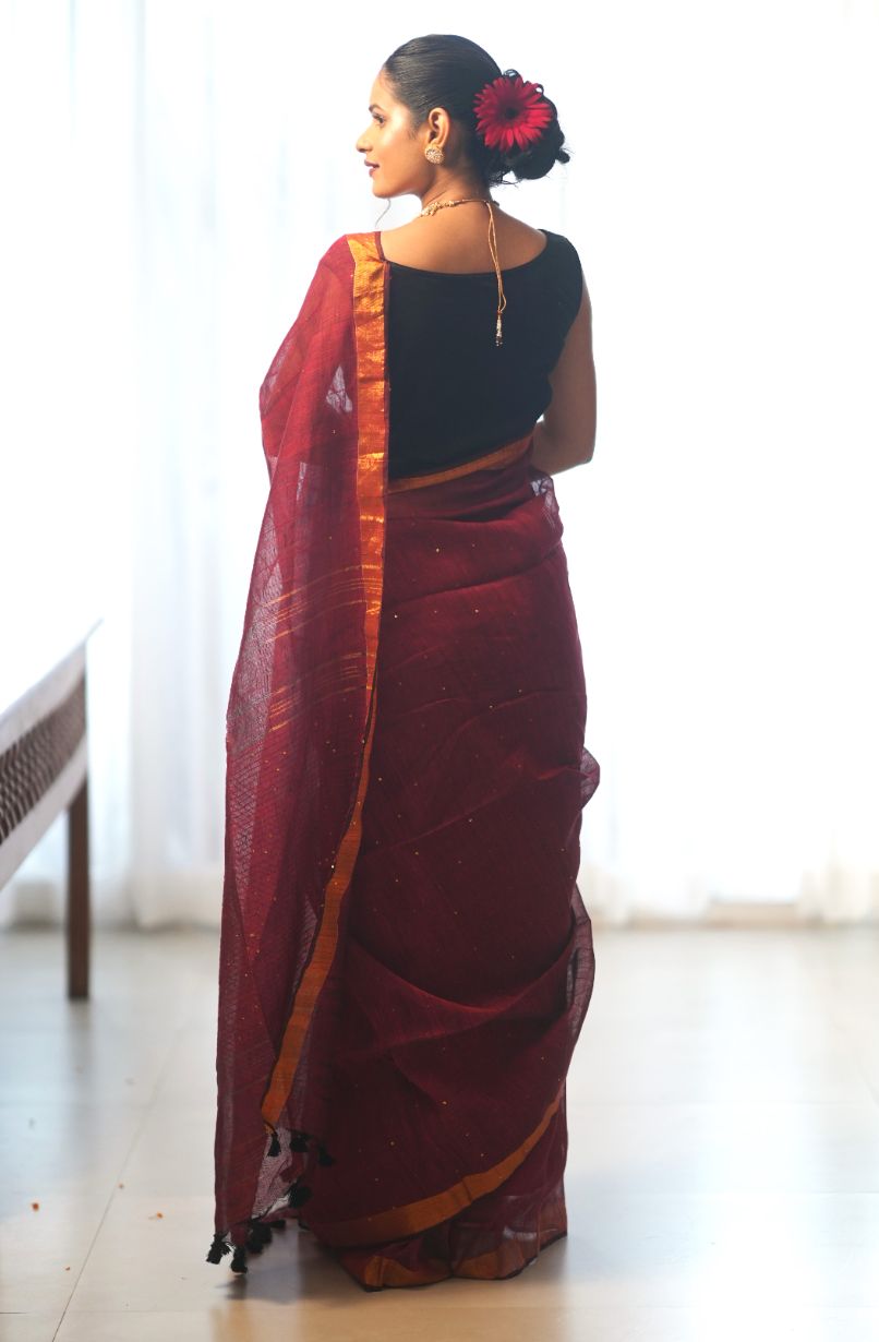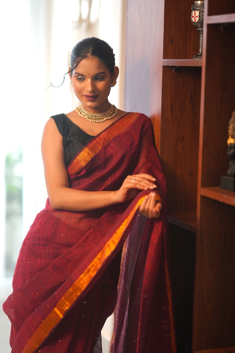 Rudrani| Maroon linen saree with golden zari & sequin highlights