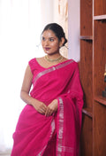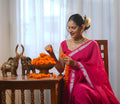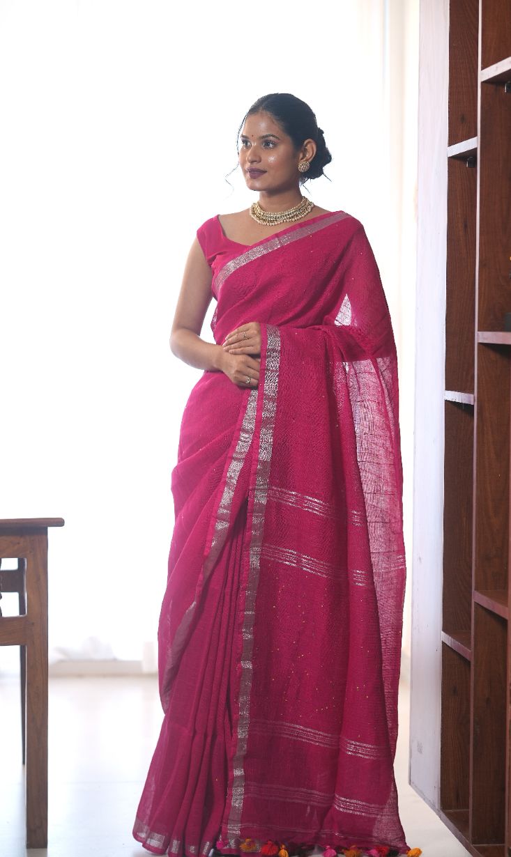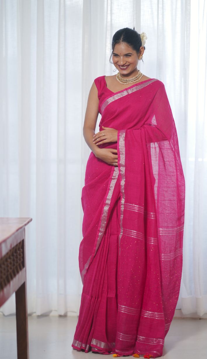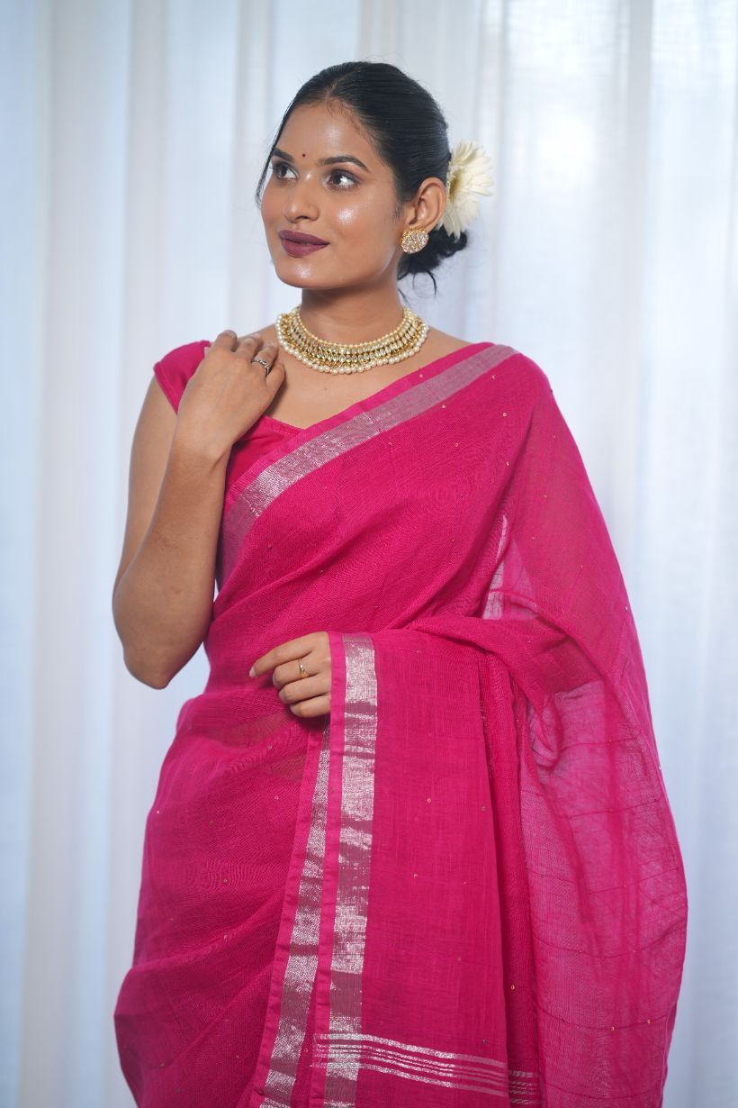 Add a dash of joy to your wardrobe with the Saanchi pink linen saree, featuring shimmering golden zari and lively sequin accents. Soft and breathable, this saree lets you twirl and sparkle effortlessly, perfect for brightening up any festive moment with a playful twist.