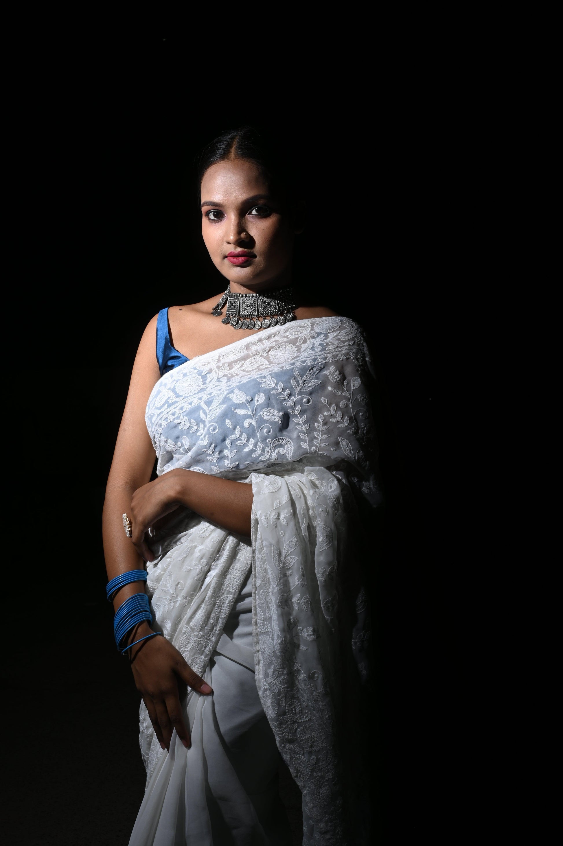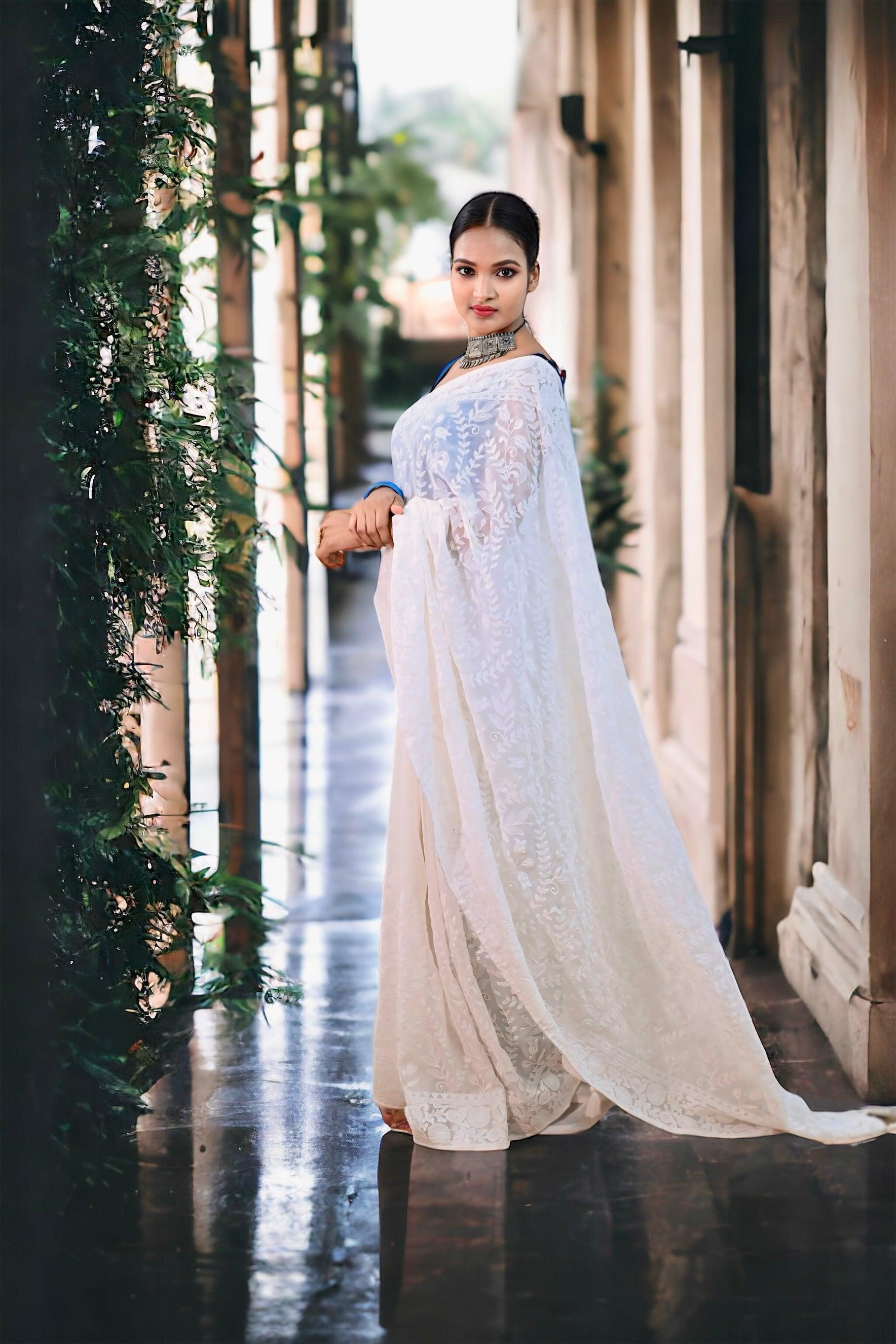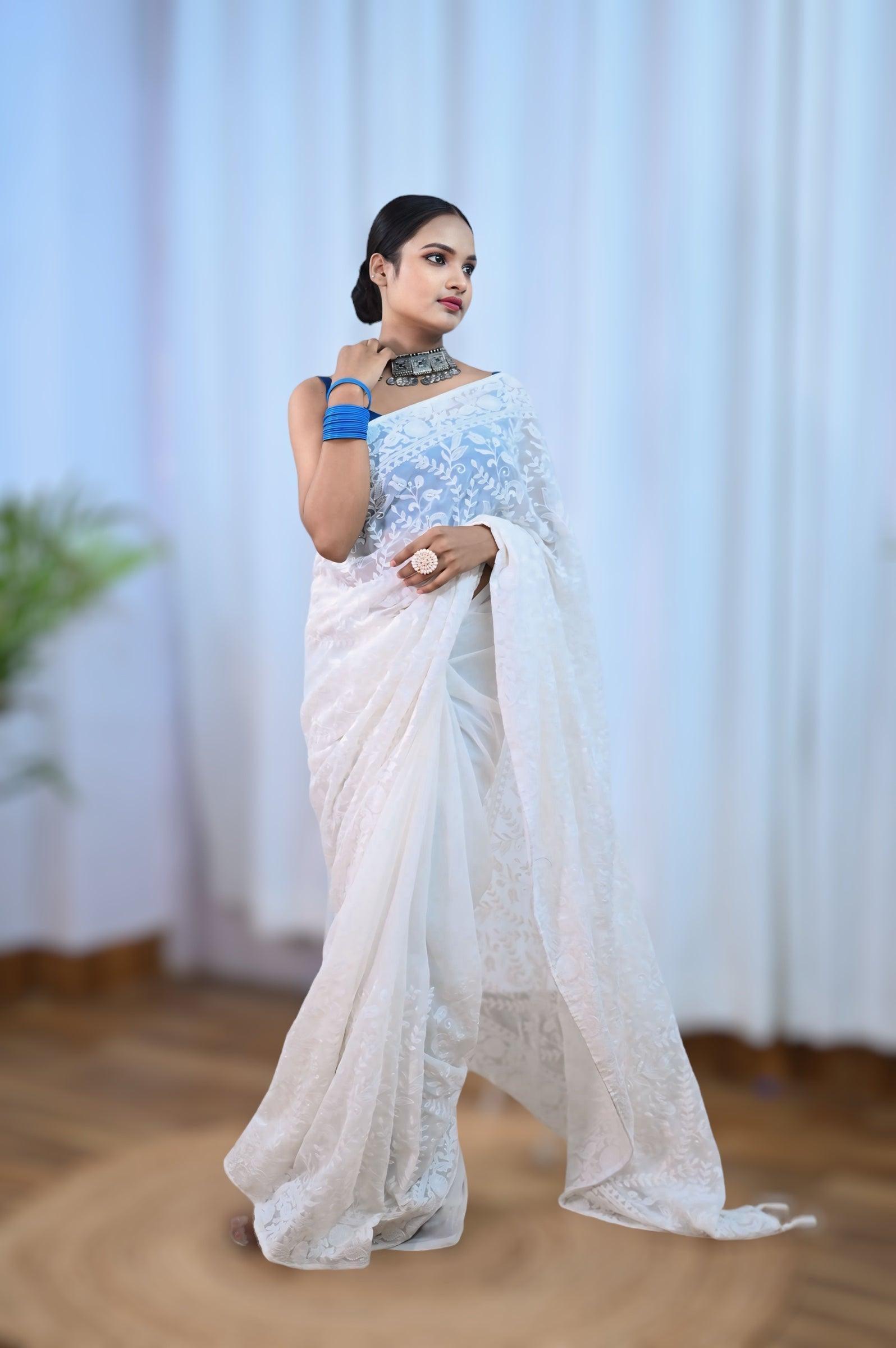 Add a timeless piece to your wardrobe with this elegant White Chiffon saree, featuring delicate Chikankari embroidery all over the body. The lightweight chiffon fabric ensures a comfortable, flowing drape, perfect for any occasion. The intricate chikankari work adds a traditional charm, making it ideal for weddings, festivals, or special gatherings. The saree comes with an unstitched blouse, giving you the flexibility to tailor the fit and style to your preference. A beautiful blend of elegance, comfort, and craftsmanship that will never go out of style.