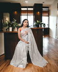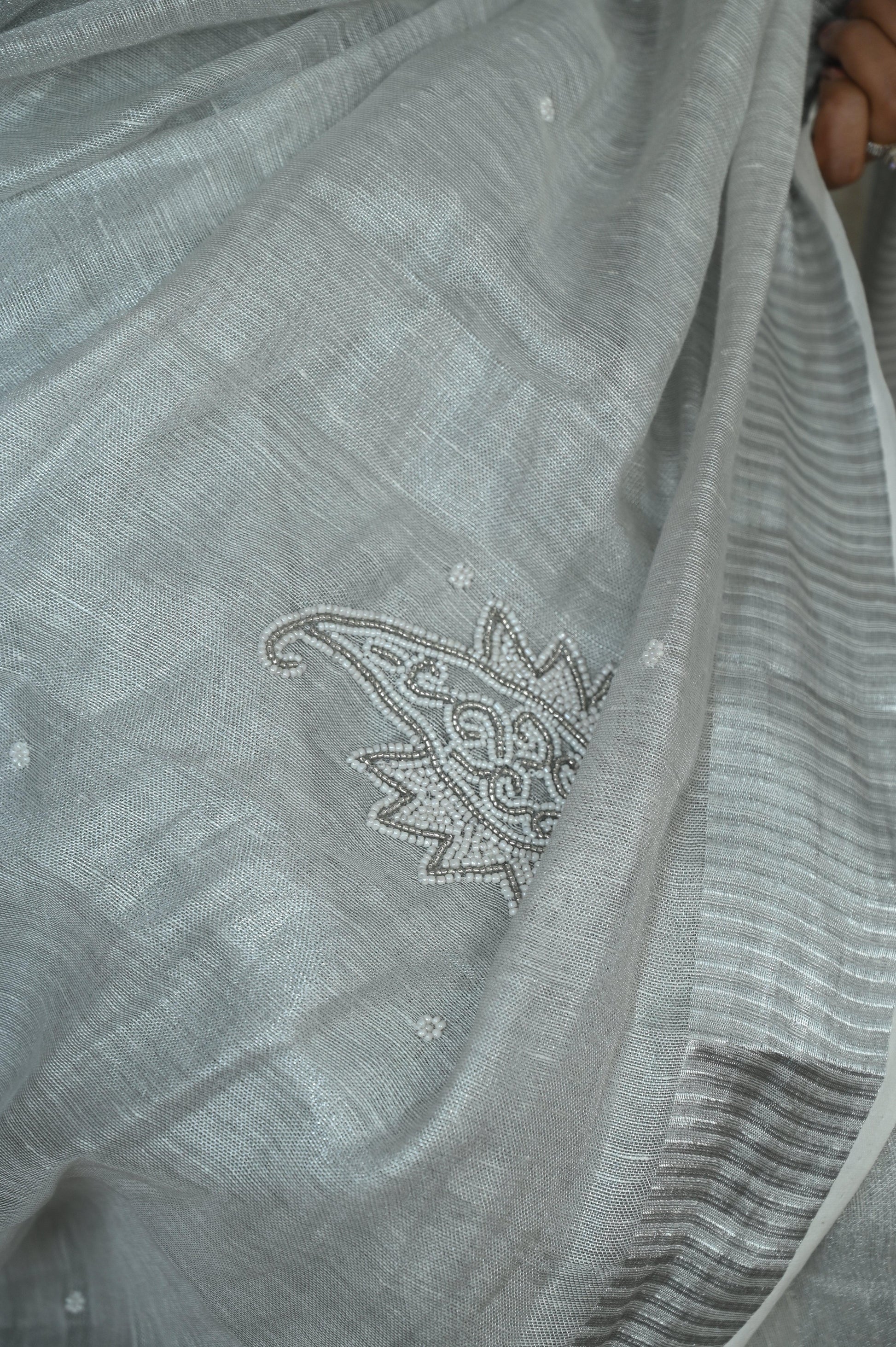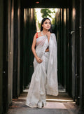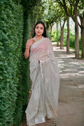 This White Tissue Linen Saree is the perfect blend of elegance and sophistication. Made from lightweight, breathable tissue linen, it features beautiful pearl hand embroidery on the body, adding a subtle yet luxurious charm. The classic white tone enhances its graceful appeal, making it ideal for both festive and formal occasions. It includes an unstitched blouse for a personalized fit. This saree offers timeless style and refined detailing for those who love minimal elegance with a handcrafted touch.