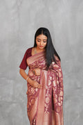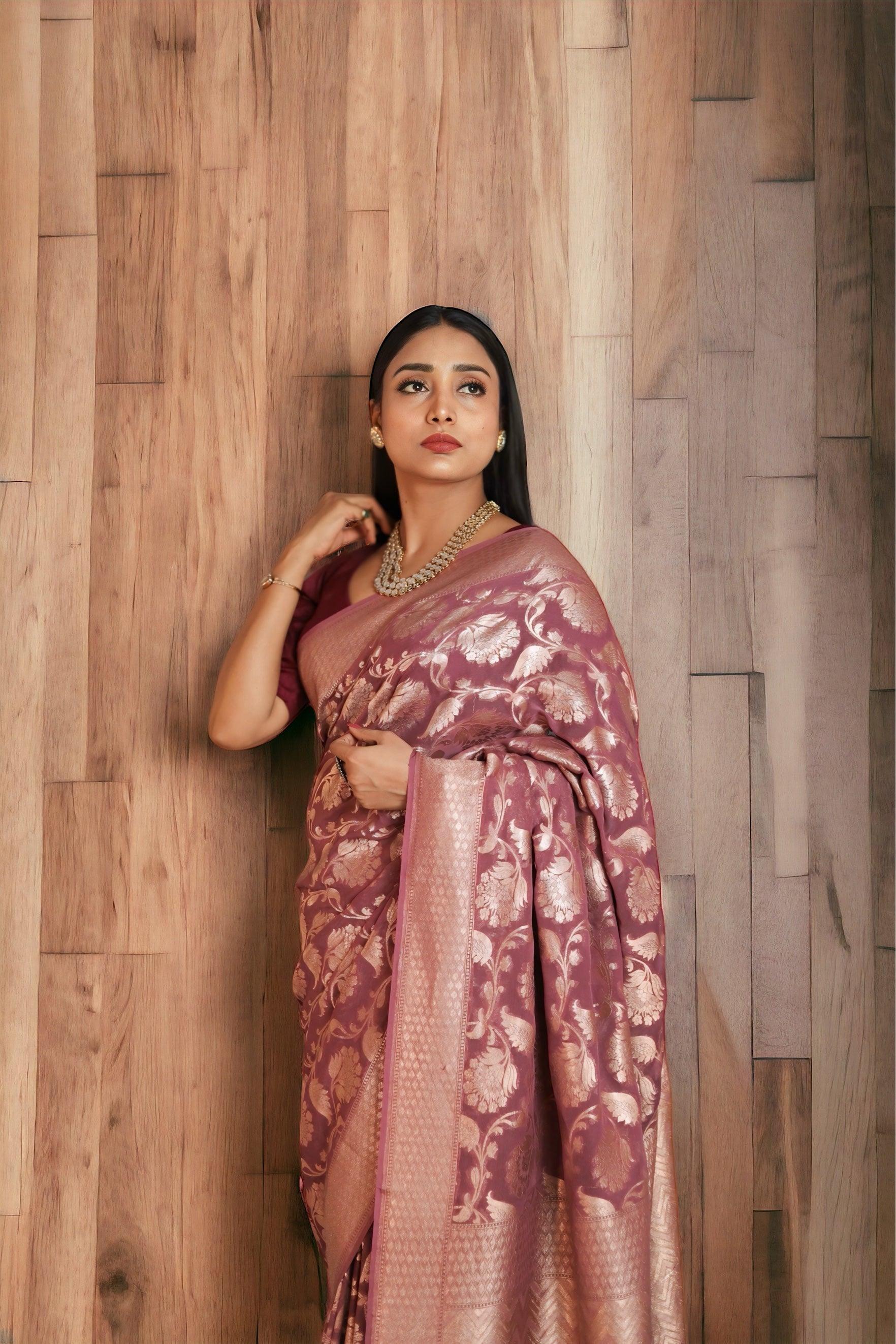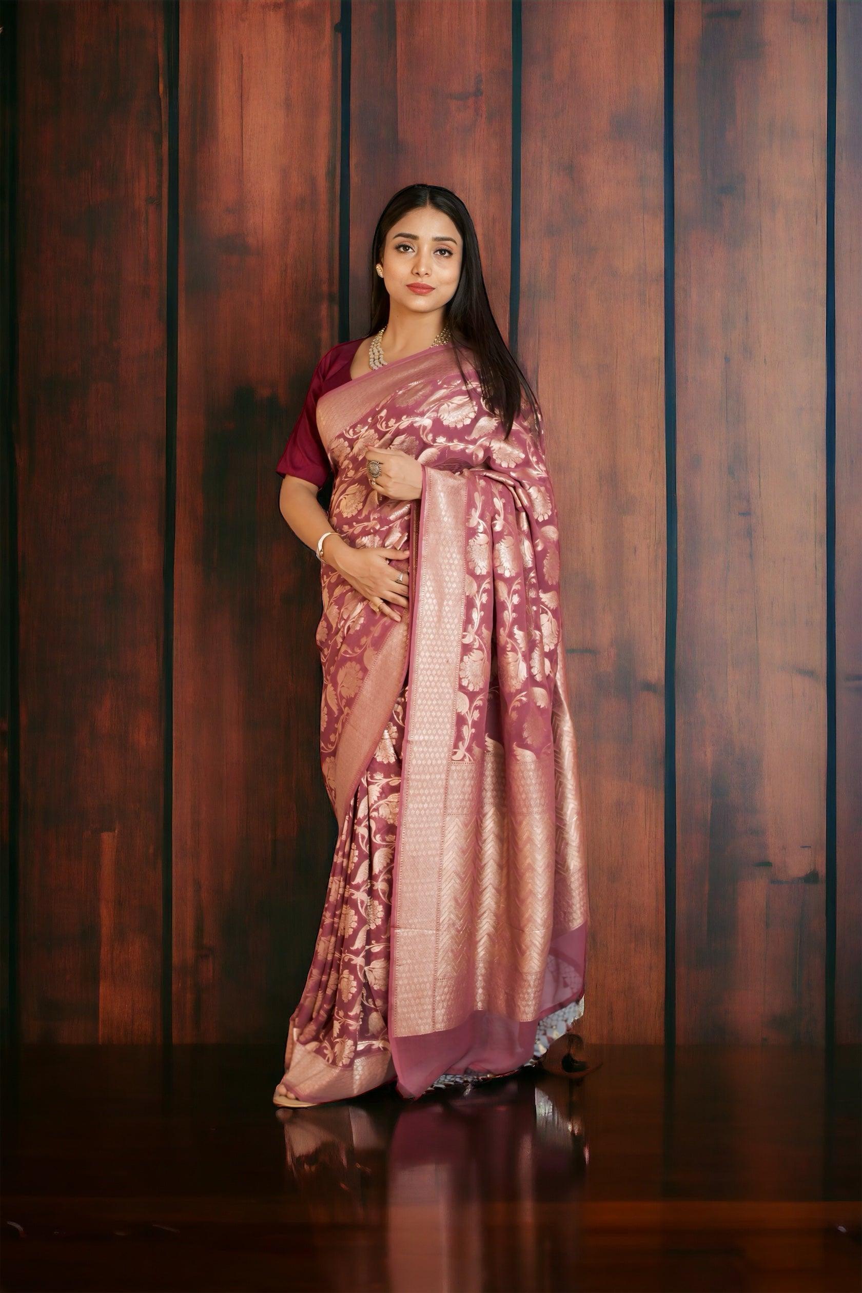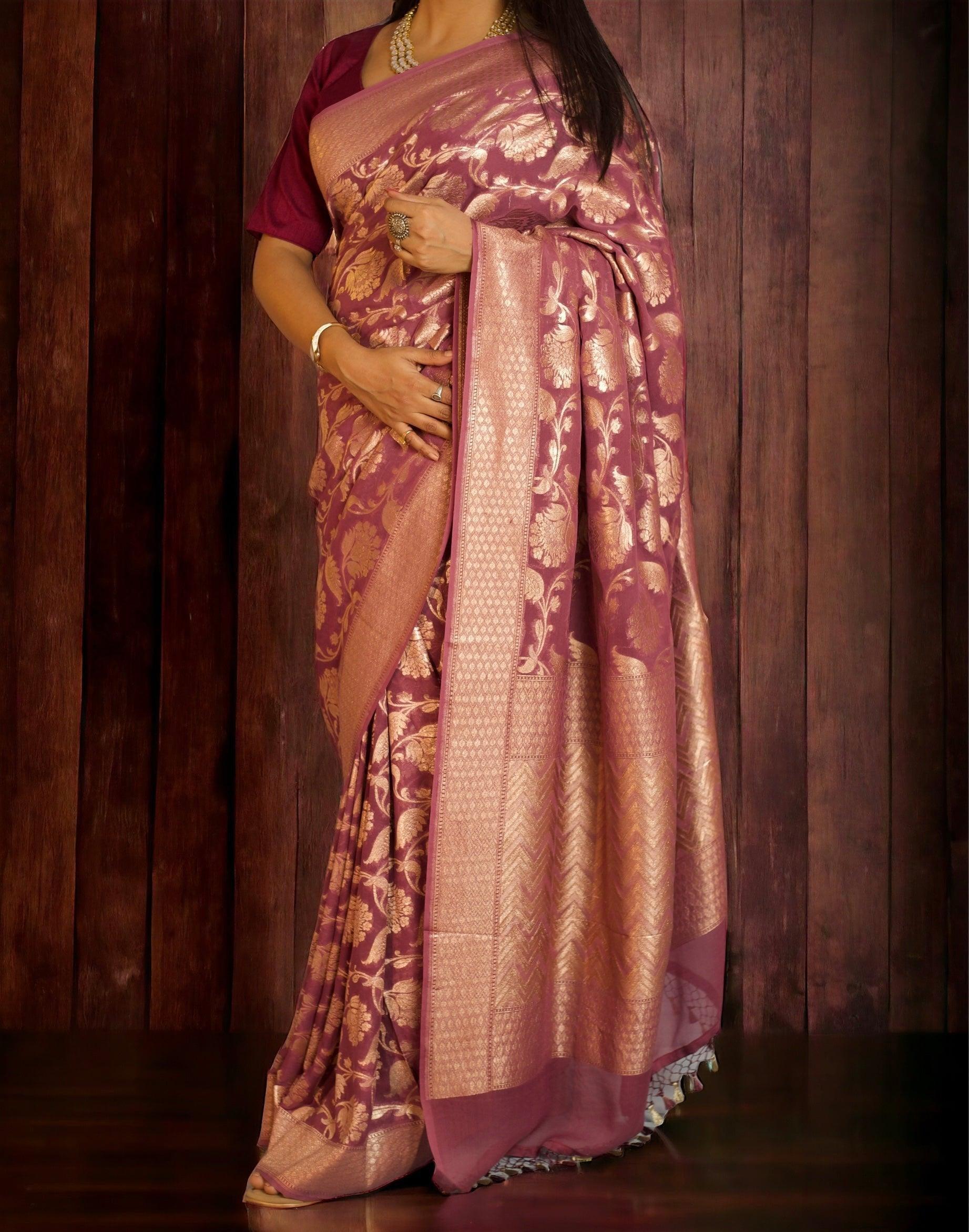 Wine Khaddi Georgette Banarasi Saree with copper Zari Jaal work